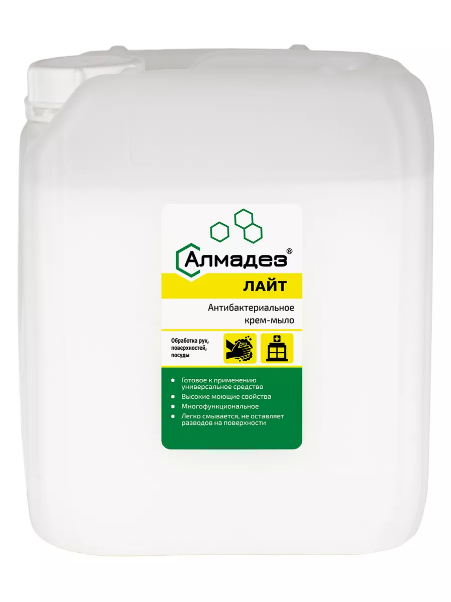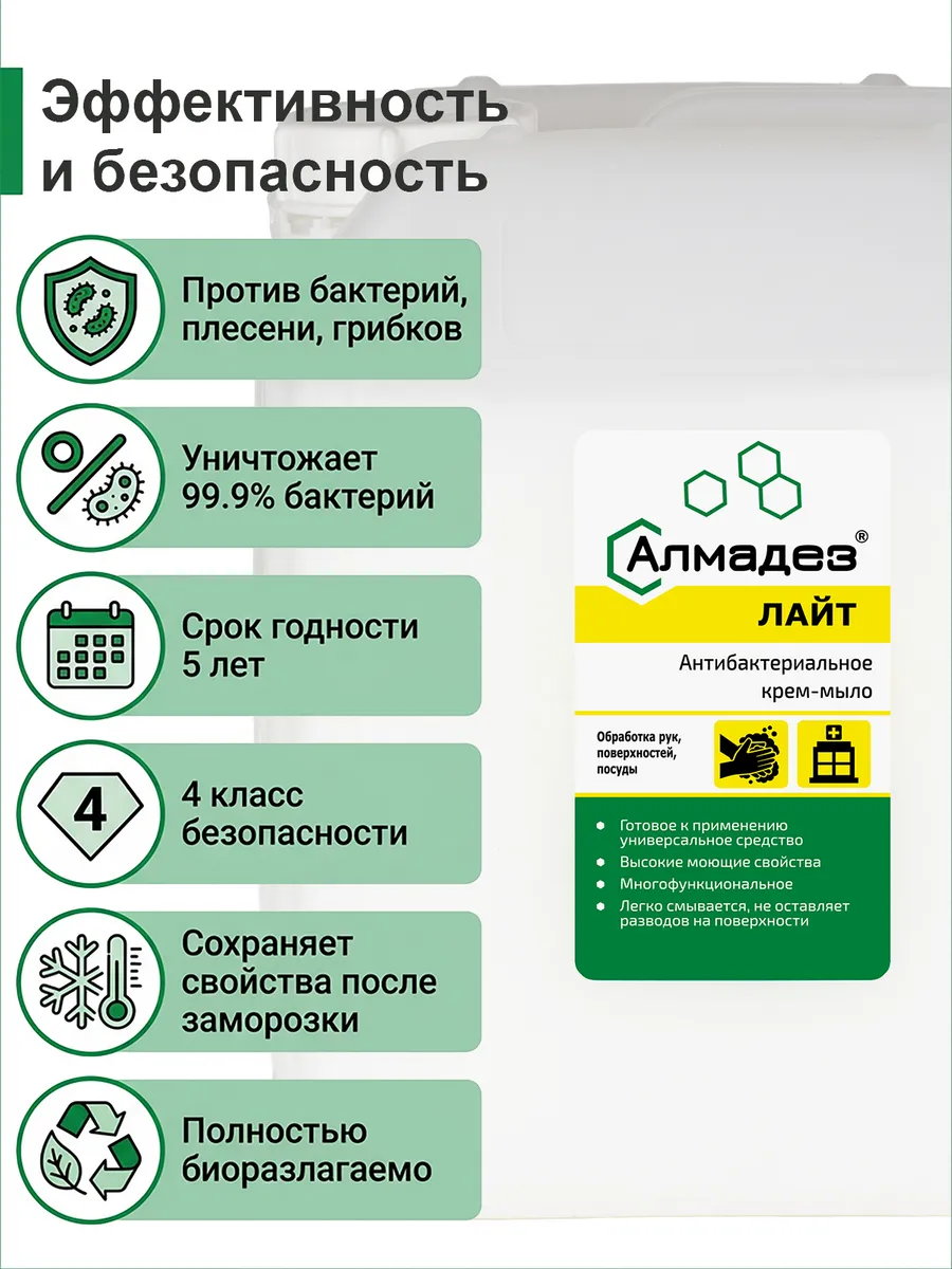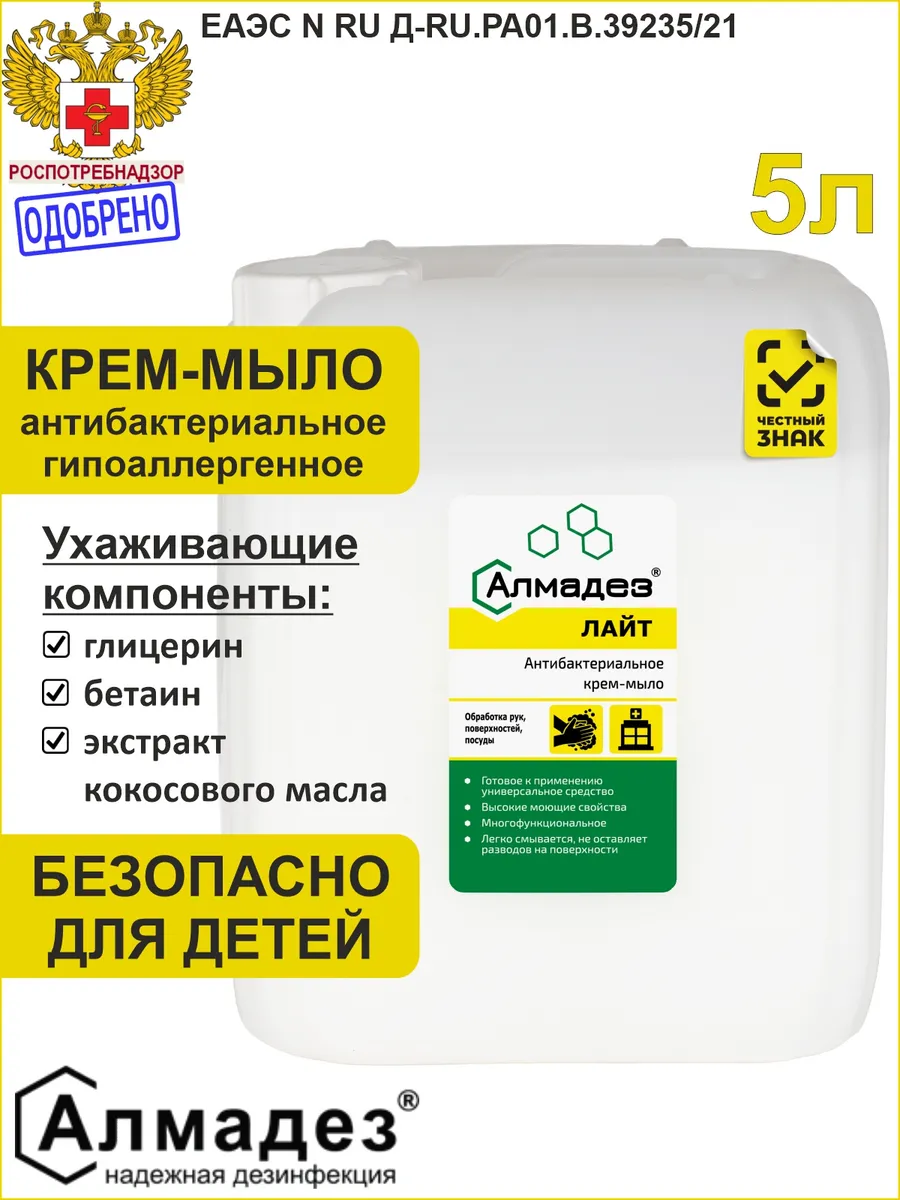Жидкое дезинфицирующее мыло «Алмадез» 5 литров — профессиональное решение для эффективной гигиены рук и посуды в условиях дома на кухне, офиса, учебных и медицинских учреждений, предприятий общественного питания. Мягкая антибактериальная формула на основе современных компонентов гарантирует надежную защиту от бактерий и бережный уход за кожей.