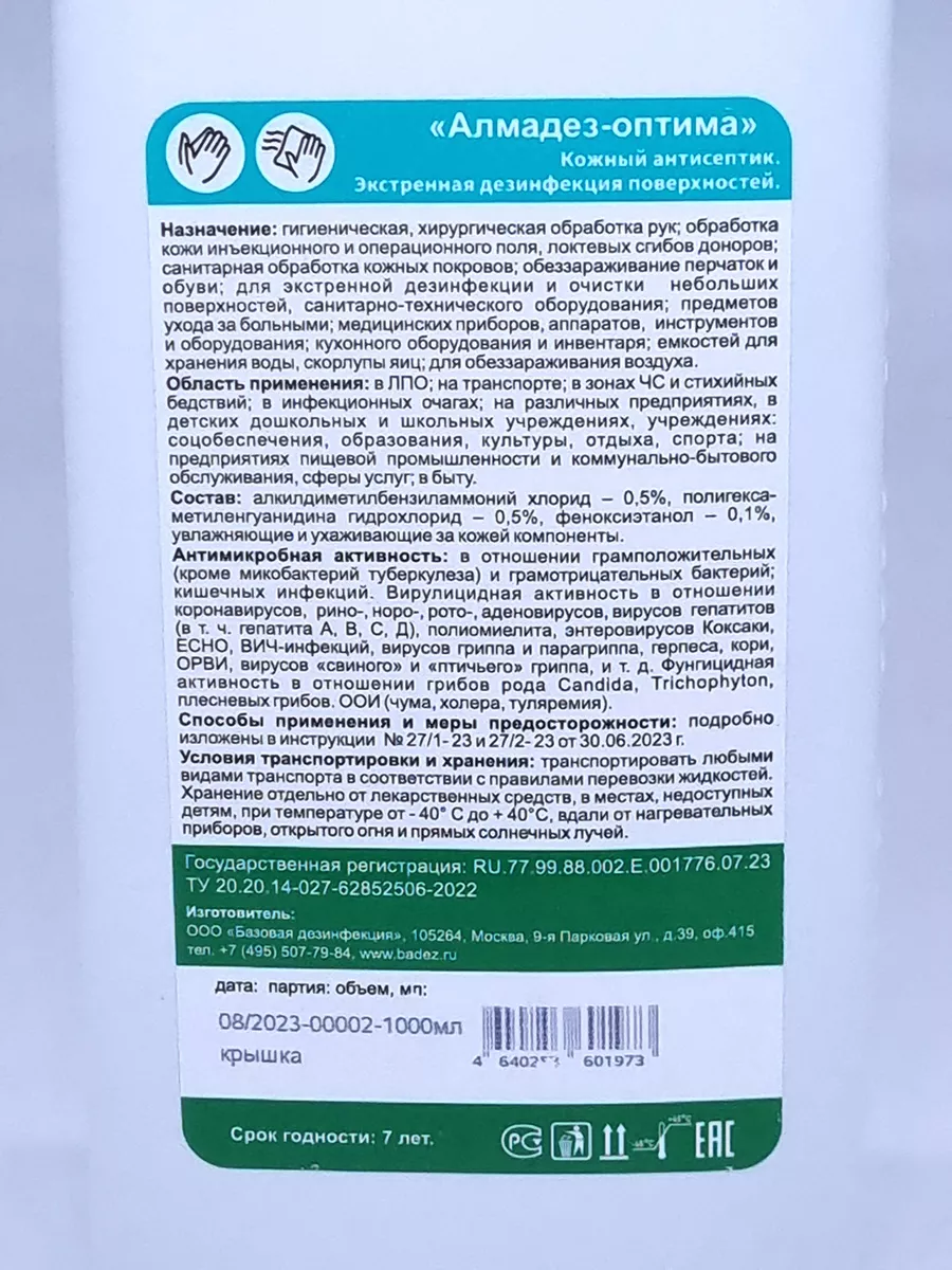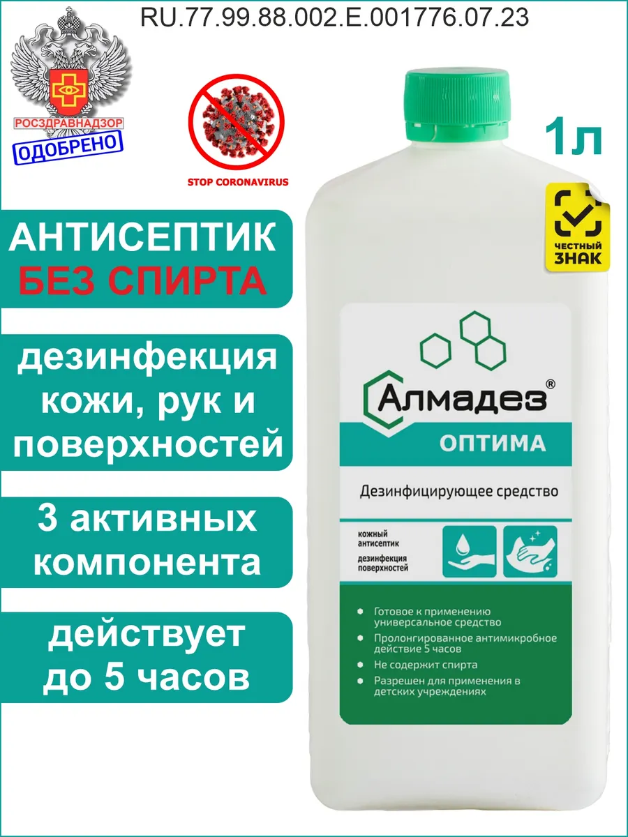 Антисептик кожный для рук и поверхностей 1л. Алмадез Оптима - это надежный антисептик без спиртовой основы. Можно использовать для детей с малых лет. Допустимый возвраст использования от 3+.