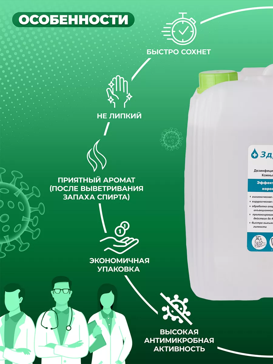 Спиртовой антисептик для рук и поверхностей "ЗдравДез" представляет собой готовую к применению прозрачную бесцветную жидкость со специфическим запахом изопропилового спирта без посторонних механических включений. В качестве действующих веществ содержит: изопропиловый спирт (2-пропанол) - 70,0 %, хлоргексидина биглюконат - 0,5 %, функциональные добавки, увлажняющие и ухаживающие за кожей компоненты.