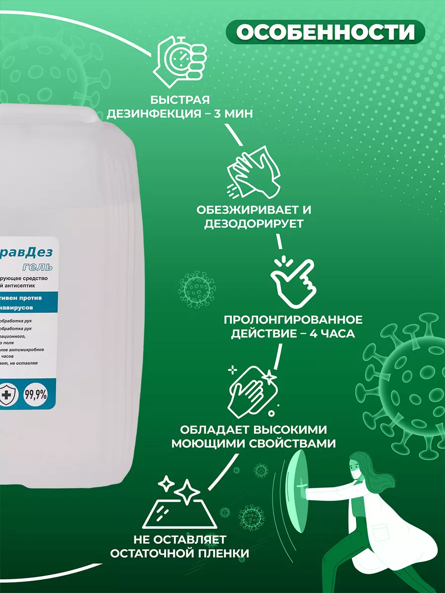 Удобная форма в виде геля, сохраняет пролонгированное антимикробное действие в течение 4 часов. Мощный состав, обладает самым широким спектром действия в отношении различных вирусов и бактерий, что делает средство универсальным и позволяет его применять не только для частного использования, но и так же на предприятиях различного типа, от салонов красоты до школ и спортивных учреждений.