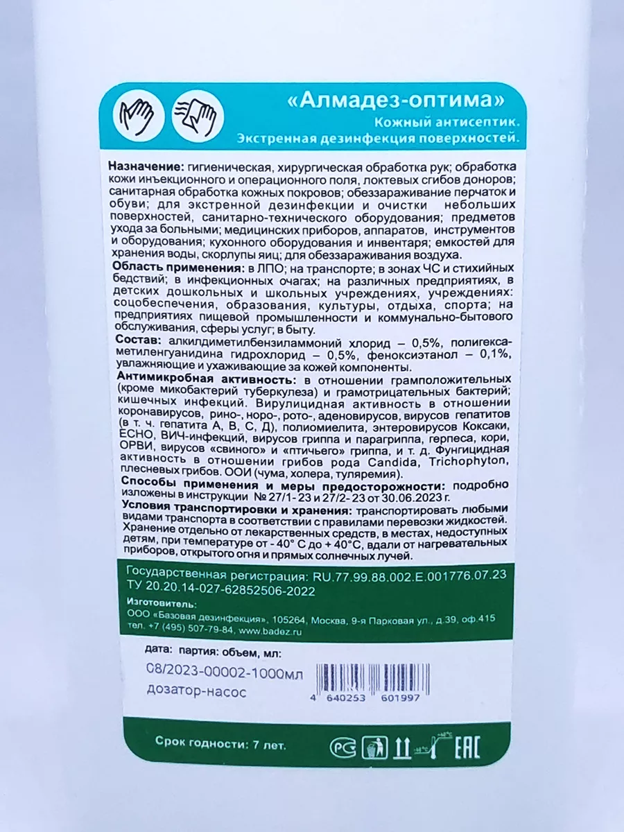 Специально разработанный для массового универсального использования, Алмадез Оптима обеспечивает эффективную защиту от бактерий и вирусов. Благодаря своему составу, он безопасен для детей и не вызывает раздражения кожи.