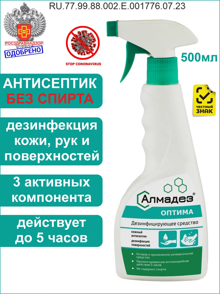 Антисептик кожный для рук и поверхностей распылитель 500 мл. Алмадез Оптима без спиртовой основы.
