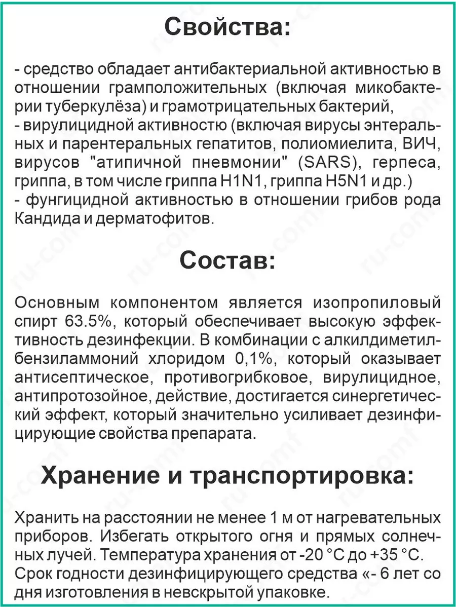 Одной из важнейших особенностей этого антисептического спрея является то, что он имеет свидетельства о государственной регистрации, а это значит, что он прошел испытания и допущен к применению. Средство обладает антибактериальной активностью в отношении как грамположительных (микобактерии туберкулеза), так и грамотрицательных бактерий, вирулицидной активностью (вирусы энтерального и парентерального гепатита, полиомиелита, ВИЧ, вирусы ОРВИ, герпеса, вирусы гриппа, в том числе гриппа H1N1, гриппа H5N1 и др. ), а также фунгицидную активность в отношении грибов рода Candida и дерматофитов. Это означает, что он может помочь защитить вас от широкого спектра вредных бактерий и вирусов.