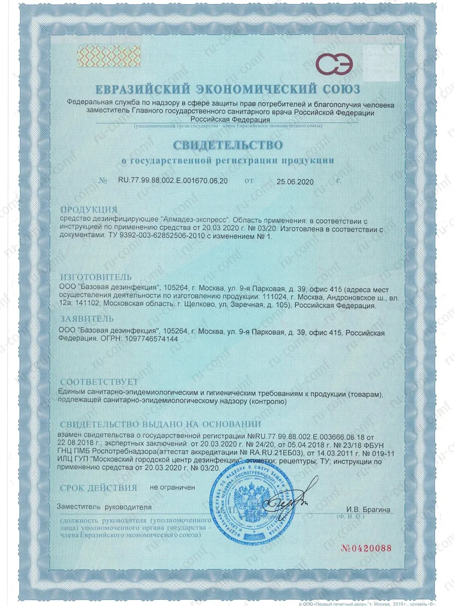 Для обеспечения максимальной безопасности и эффективности препарат прошёл тщательные испытания и получило свидетельства о государственной регистрации. Это означает, что вы можете доверять этому продукту в обеспечении высочайшего уровня дезинфекции без ущерба для безопасности или качества.