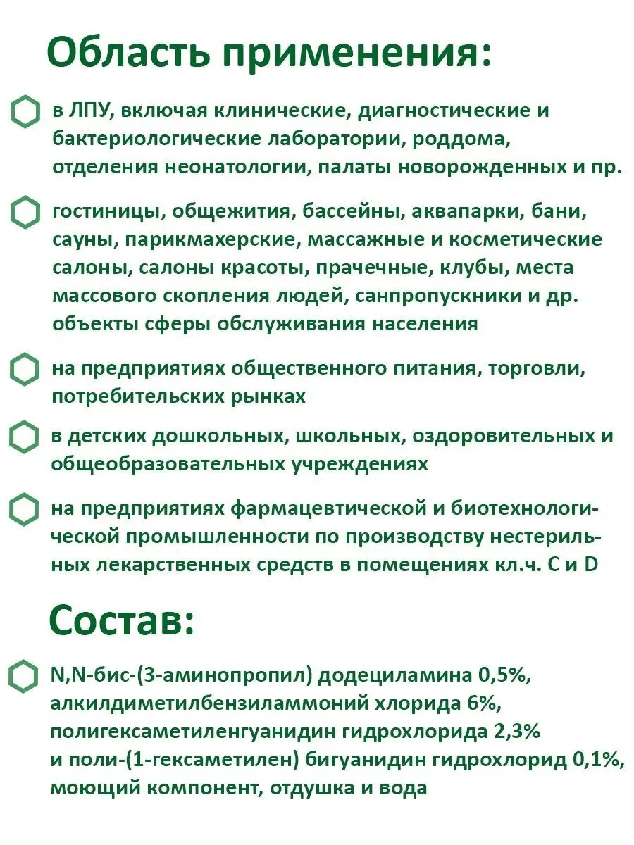 Максимальная эффективность благодаря сочетанию 4 действующих веществ с высоким синергизмом действия, обеспечивает эффективную обработку поверхностей и рук, гарантируя стерильность и безопасность для вас и ваших клиентов.