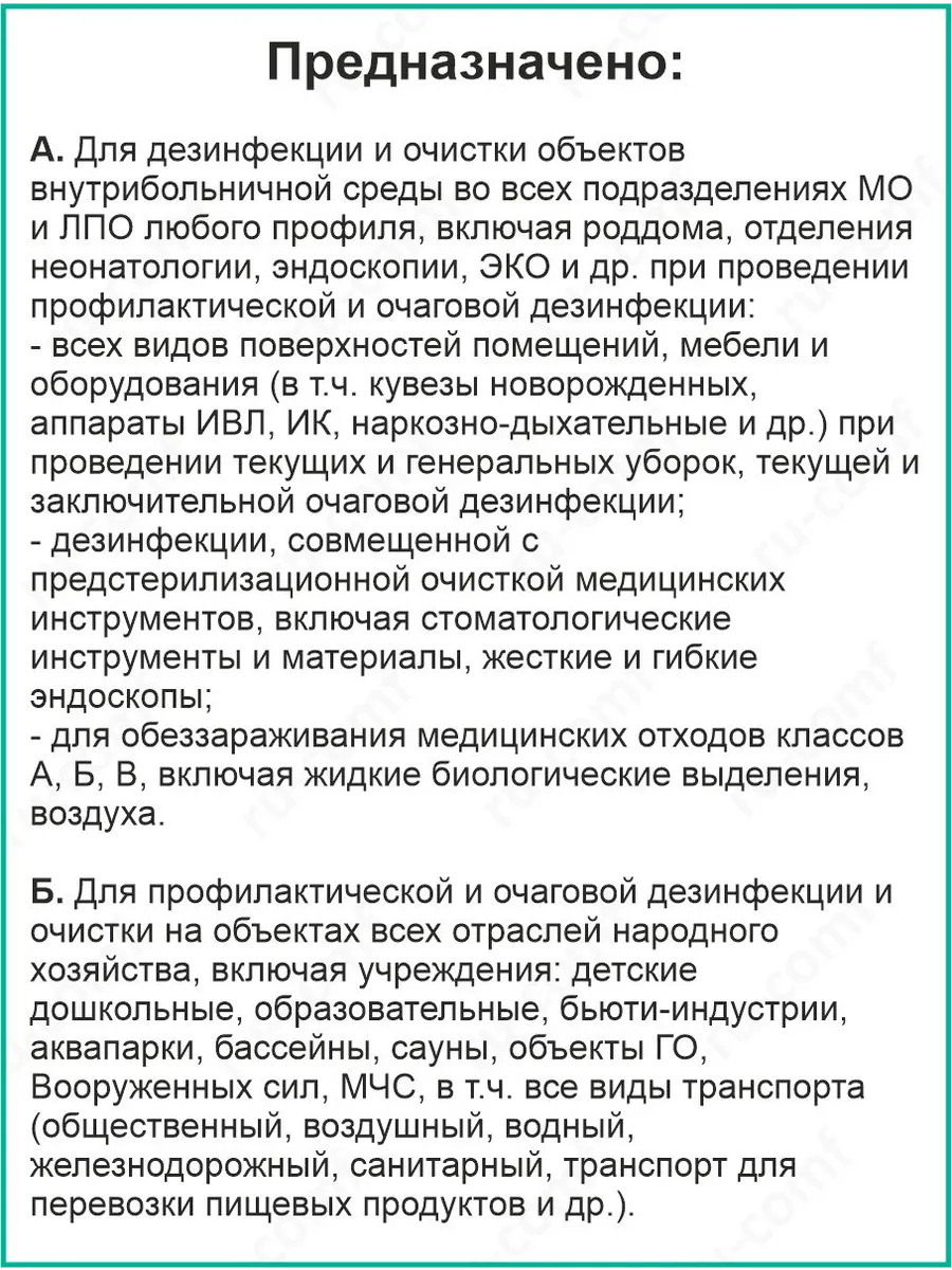 А так же эффективностью против плесневых грибов и рода Кандида, Трихофитон (дерматофитий), возбудителей легионеллеза и особо опасных инфекций (чумы, холеры, туляремии).