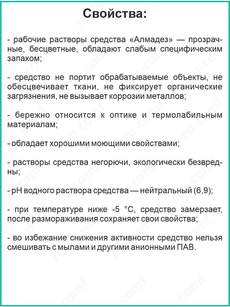 Алмадез концентрат с моющим эффектом представляет собой прозрачную жидкость зеленого цвета со слабым специфическим запахом.