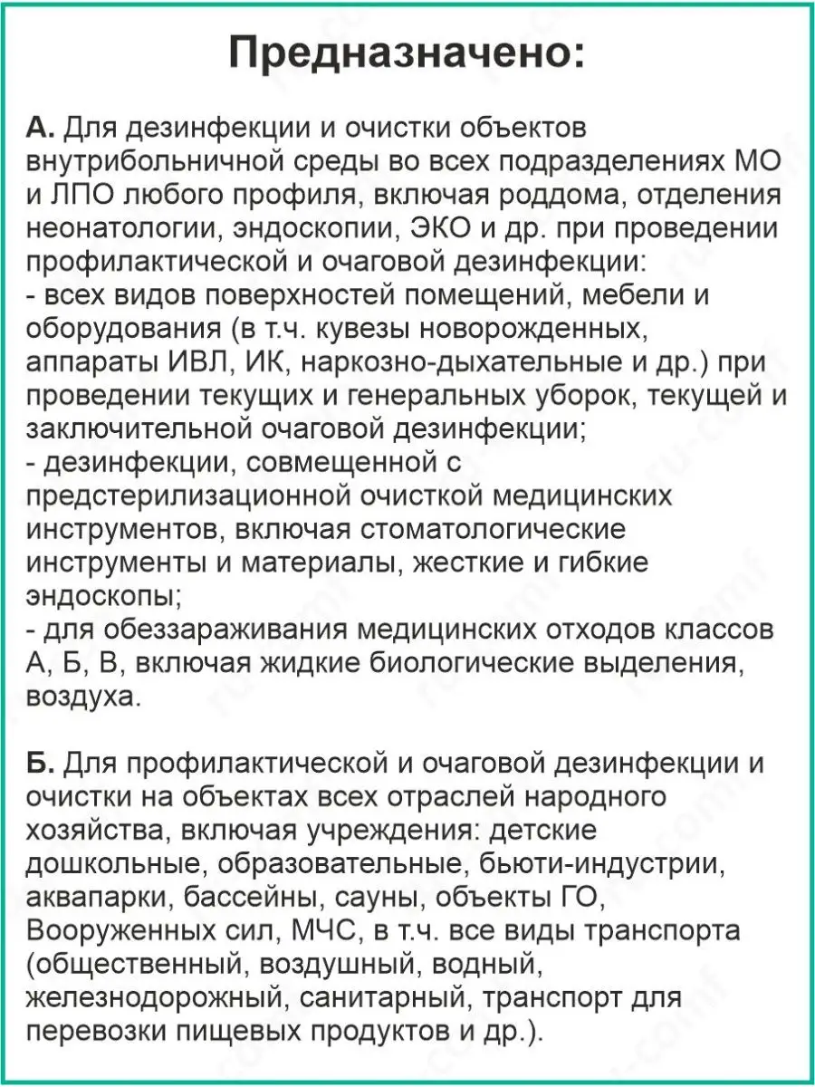 А так же эффективностью против плесневых грибов и рода Кандида, Трихофитон (дерматофитий), возбудителей легионеллеза и особо опасных инфекций (чумы, холеры, туляремии).