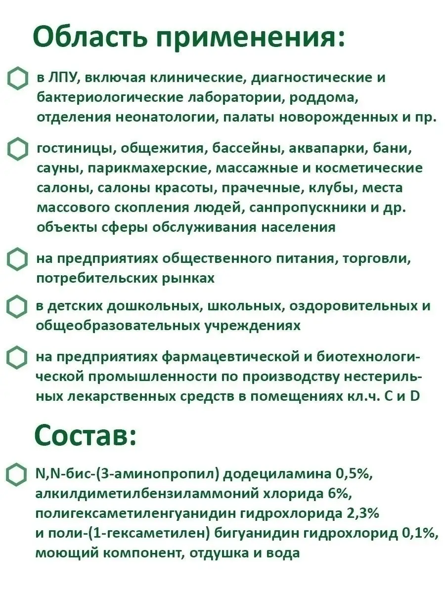 Дезинфектор обладает широким спектром применимости. Дезинфицирующее средство подходит для очистки перед стерилизацией. Можно использовать дома для влажной уборки, в маникюрных салонах красоты. Для дезинфекции инструментов маникюра и педикюра (подологии), наращивания ресниц и парикмахерских. А так же в стоматологических и медицинских целях и как антисептик. За счет своего уникального состава, оно не портит обрабатываемые объекты, не обесцвечивает ткани, не фиксирует органические загрязнения и не вызывает коррозии металлов. Разрешен для оптики и эндоскопов.