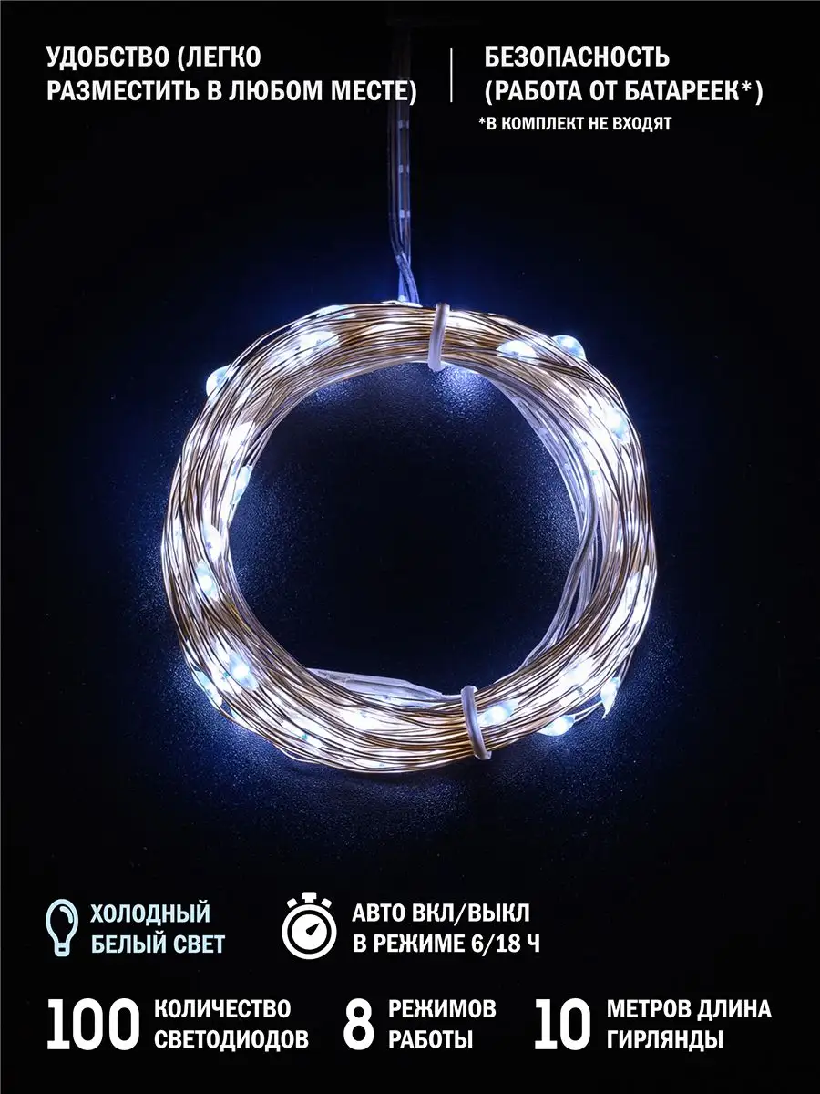 Корпус выполнен из металла и имеет степень защиты IP20, что обеспечивает безопасную эксплуатацию в помещении. Количество мини фонариков на изделии составляет 100 шт., а интервал между ними всего 10 см. Также есть возможность выбрать один из 8 режимов работы, чтобы подобрать наиболее подходящую для вашего случая.