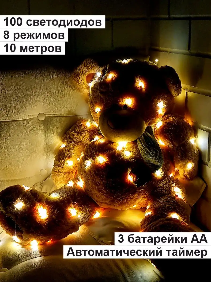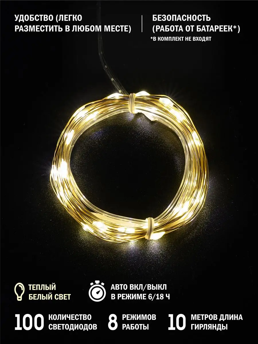 Корпус выполнен из металла и имеет степень защиты IP20, что обеспечивает безопасную эксплуатацию в помещении. Количество мини фонариков на изделии составляет 100 шт., а интервал между ними всего 10 см. Также есть возможность выбрать один из 8 режимов работы, чтобы подобрать наиболее подходящую для вашего случая.