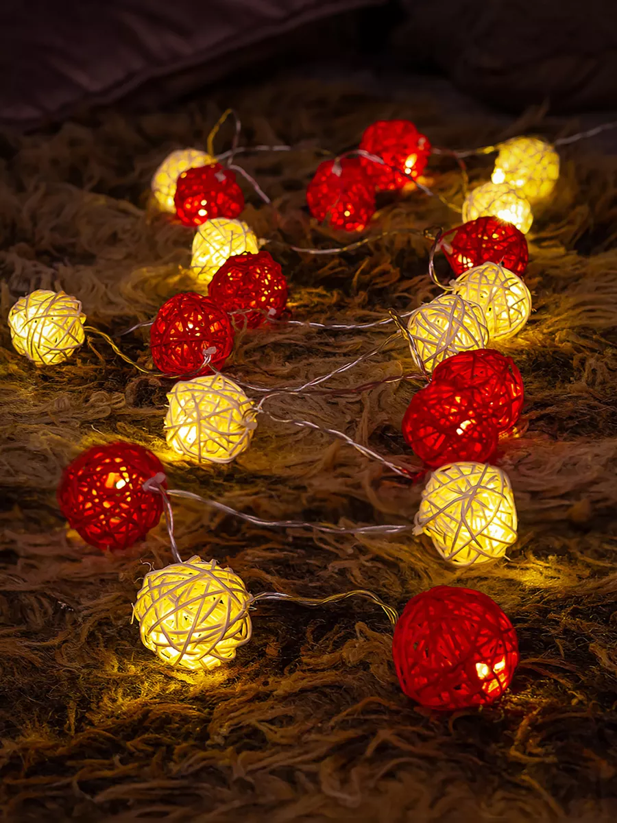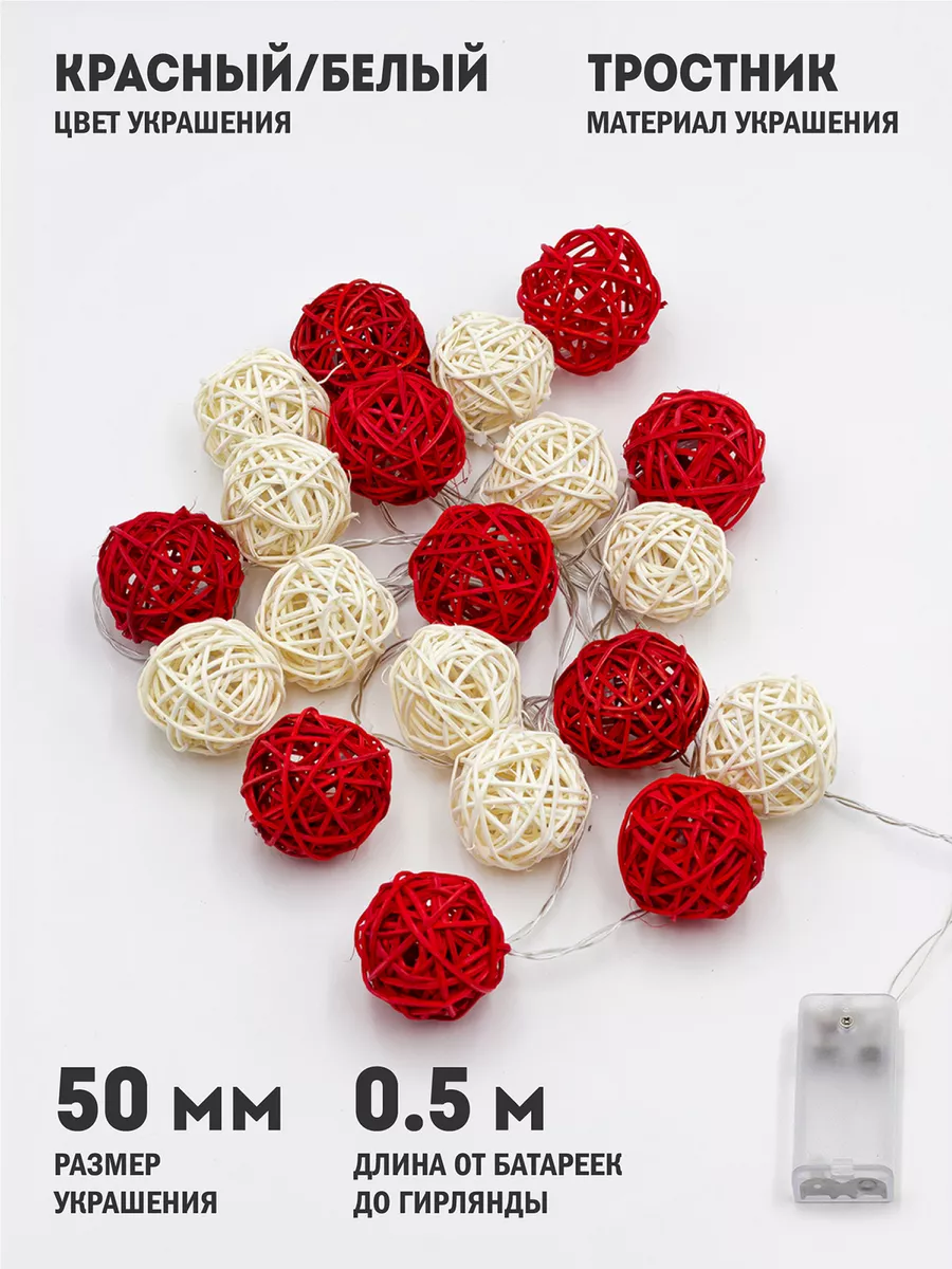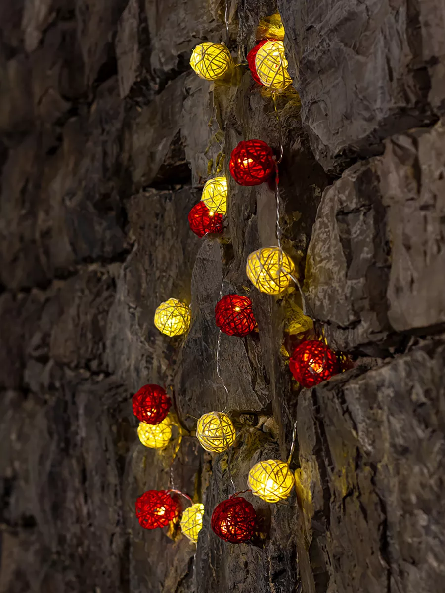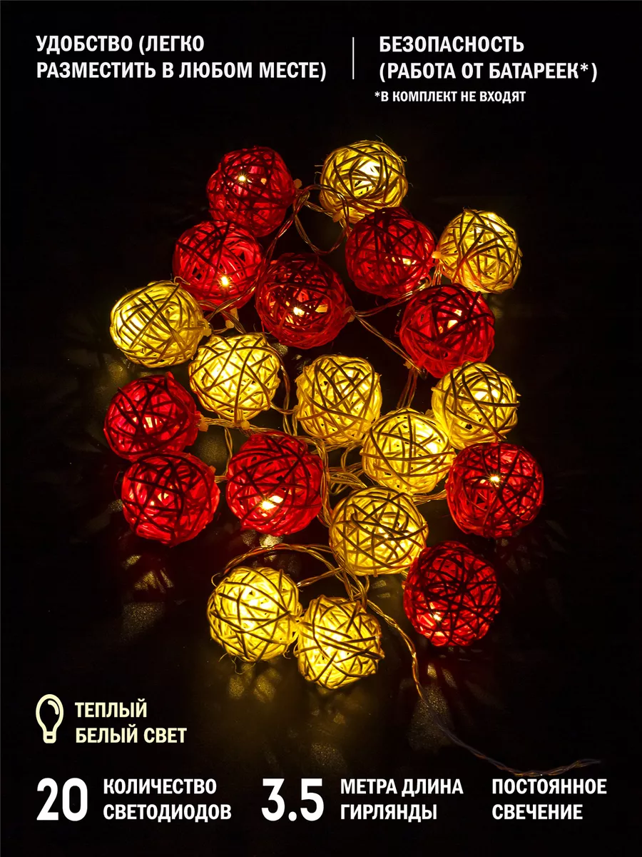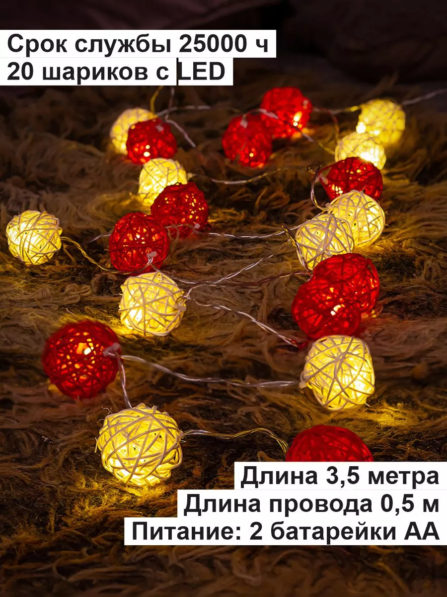 Она состоит из 20 лампочек, красного и желтого цвета. Излучают теплый свет. Светодиодные шарики, расположенны на расстоянии 0.15 м друг от друга. Каждый шарик выполнен из натурального хлопка и прочного пластика, что делает его очень прочным и долговечным.