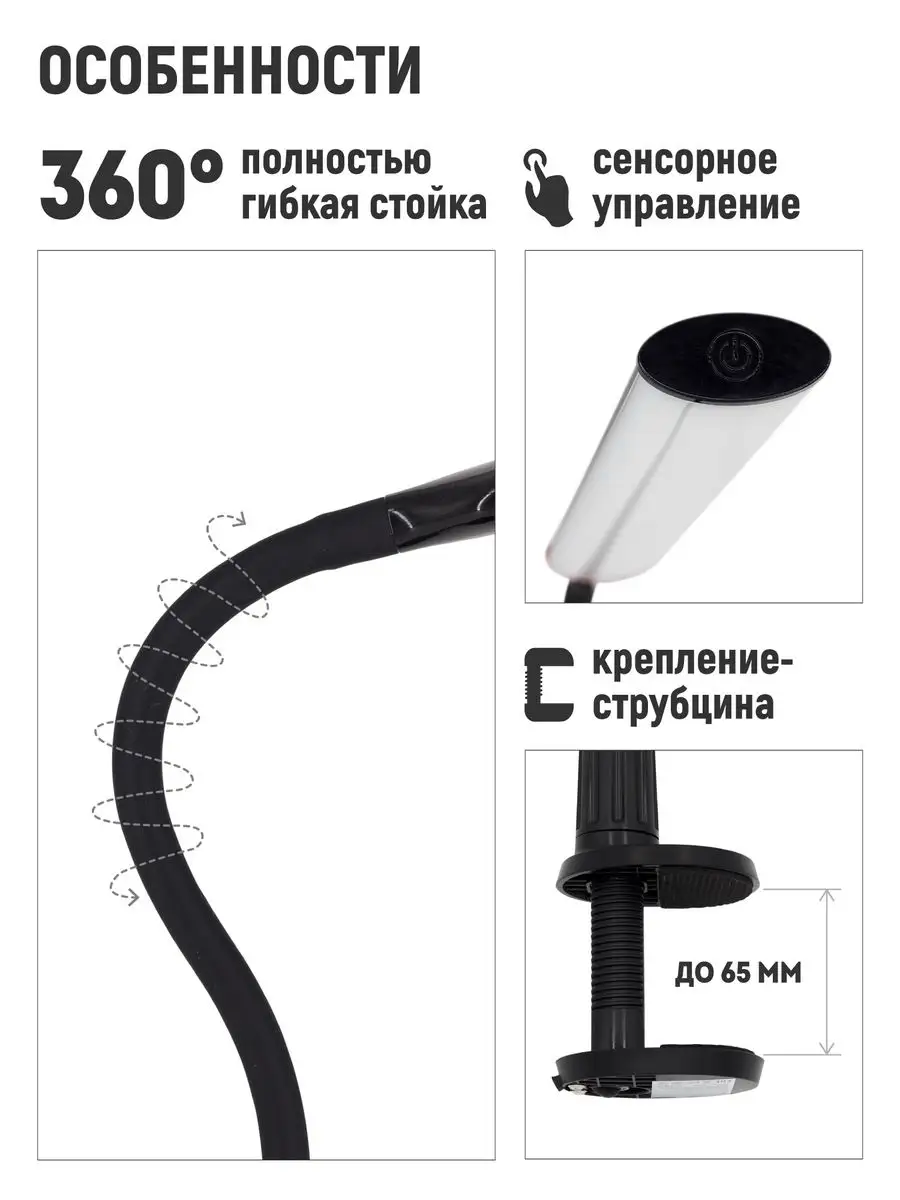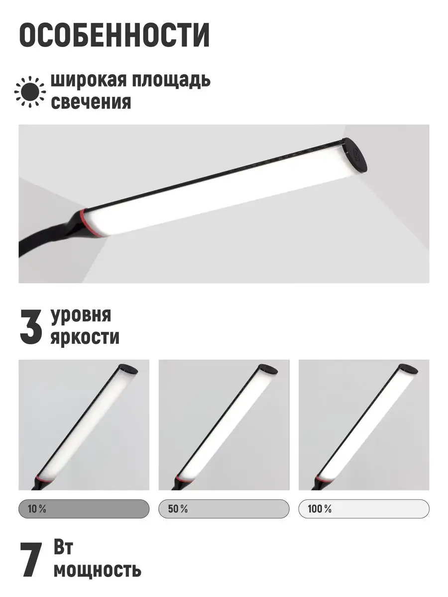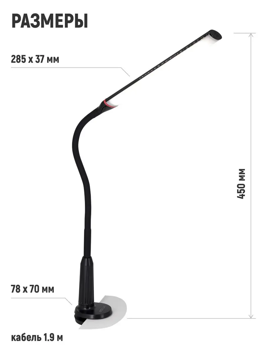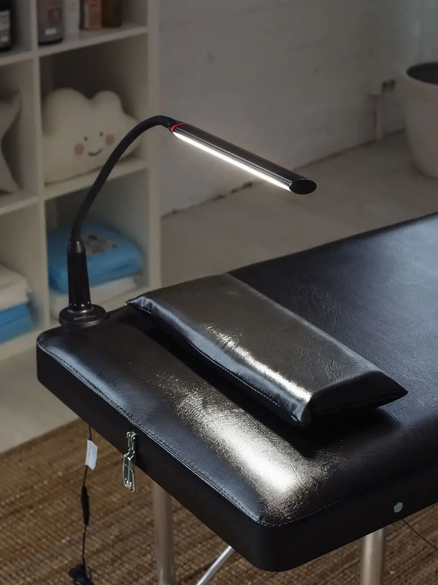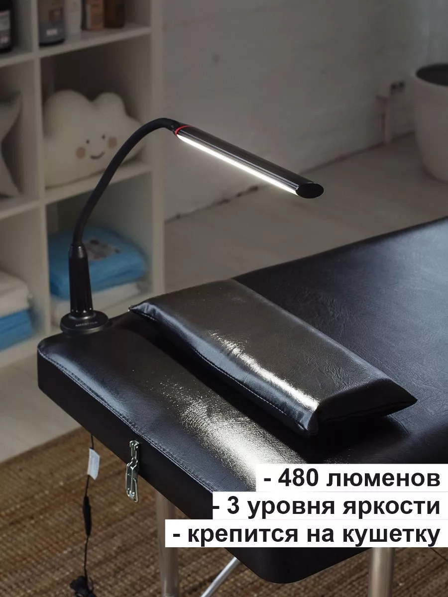 Лампа настольная светодиодная для наращивания ресниц профессиональная яркая. Удобное крепление струбцина. Длинная, полностью гибкая стойка. Регулируемая яркость: 3 уровня. Сенсорное управление. Потребляемая мощность: 7Вт. Световой поток 480 лм. Цветовая температура: 5000К. Коэффициент цветопередачи: более 80. Средний срок службы: 30 000 ч. Размер подставки 70 мм. Высота стойки 440 мм. Длина плафона 285 мм. Расстояние от рассеивателя до поверхности стола 370 мм. Благодаря полностью гибкой стойке, а также достаточной ее длине, светильник может принимать любую форму, что позволяет настроить направление освещения по своему вкусу и необходимостью. Светильник оснащен простым, интуитивно понятным сенсорным управлением. Сочетание специально подобранного рассеивателя и высококачественного белого света светильник помогает минимизировать блики и нагрузку на глаза. Он обеспечивает комфорт глаз, устраняя мерцание света. Лампа крепится на струбцине, что позволяет экономить рабочее пространство. Пусть рабочее место станет удобным!