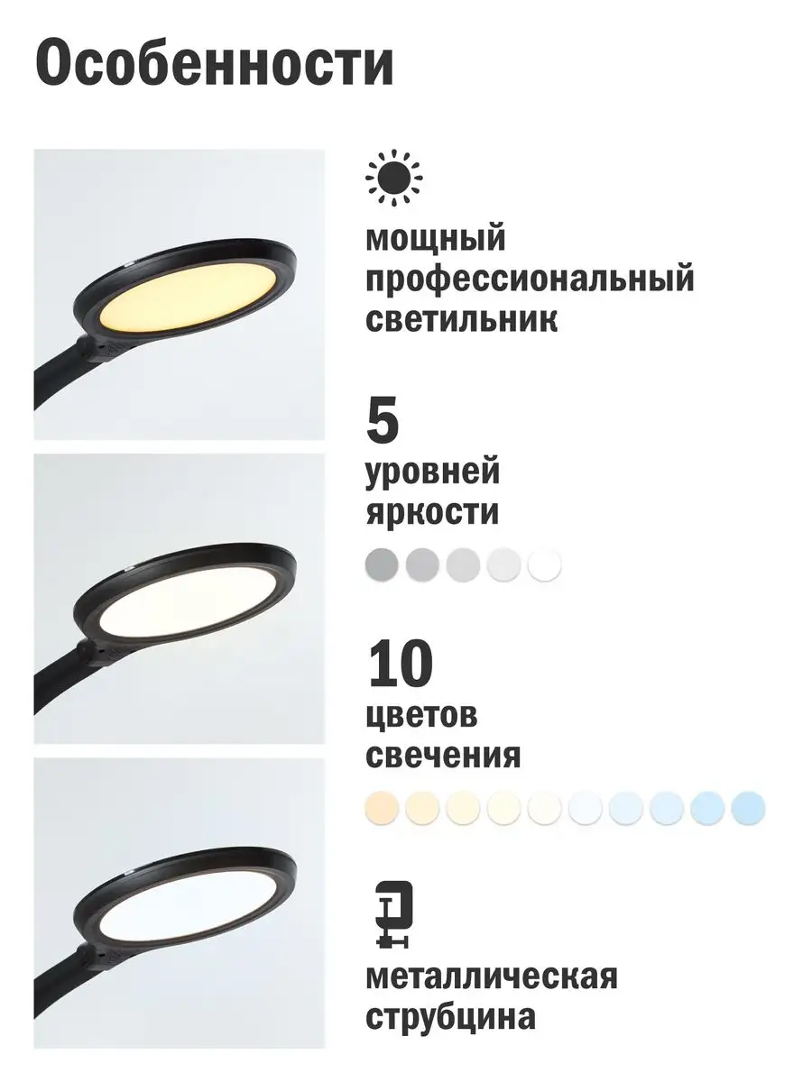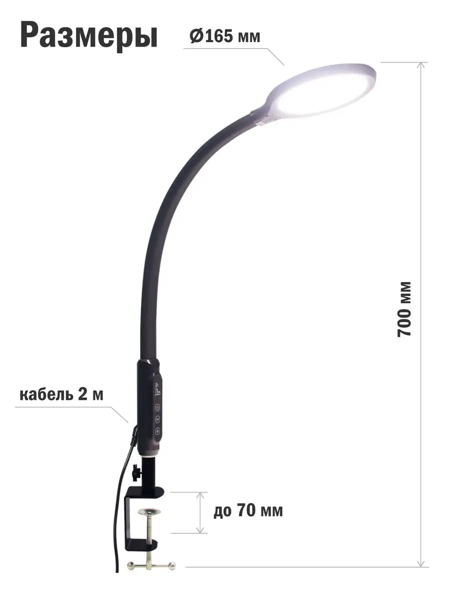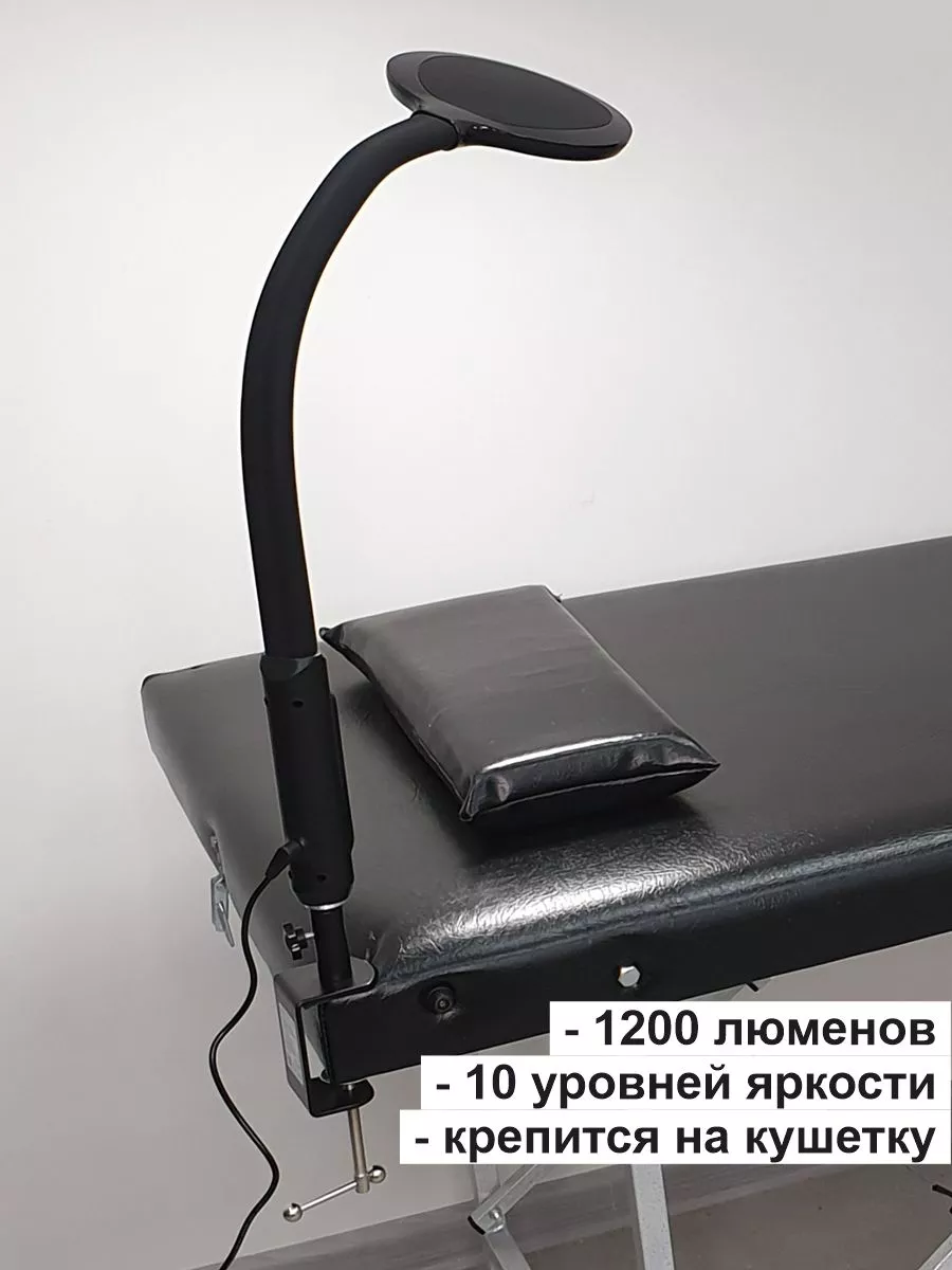 Удобная высокотехнологичная светодиодная лампа для наращивания ресниц, бровиста, косметологическая лампа. Может также использоваться как настольная лампа для школьника, лампа для маникюра и наращивания ногтей, настольная лампа для рабочего места. Безграничные возможности по настройке и регулировке света - можно регулировать степень освещенности и температуру света (10 уровней регулировки). С помощью надежной стальной струбцины лампу можно прикрепить к любой горизонтальной поверхности толщиной до 7 см, в том числе к косметологической кушетке. Гибкая стойка светильника позволяет вращать плафон в любой плоскости.Лампа очень яркая, благодаря использованию современных светодиодов, срок службы которых 30000 часов. Хорошая плотность светового потока (1200 Люменов), большая площадь освещения.**Технические характеристики:**- Мощность - 18 Вт- Световой поток - 1200 лм- Цветовая температура - 2000-6000 К- Срок службы - 30000 ч- Питание вход - 100-240В, 50/60 Гц- Питание выход - 13В/1.3А.