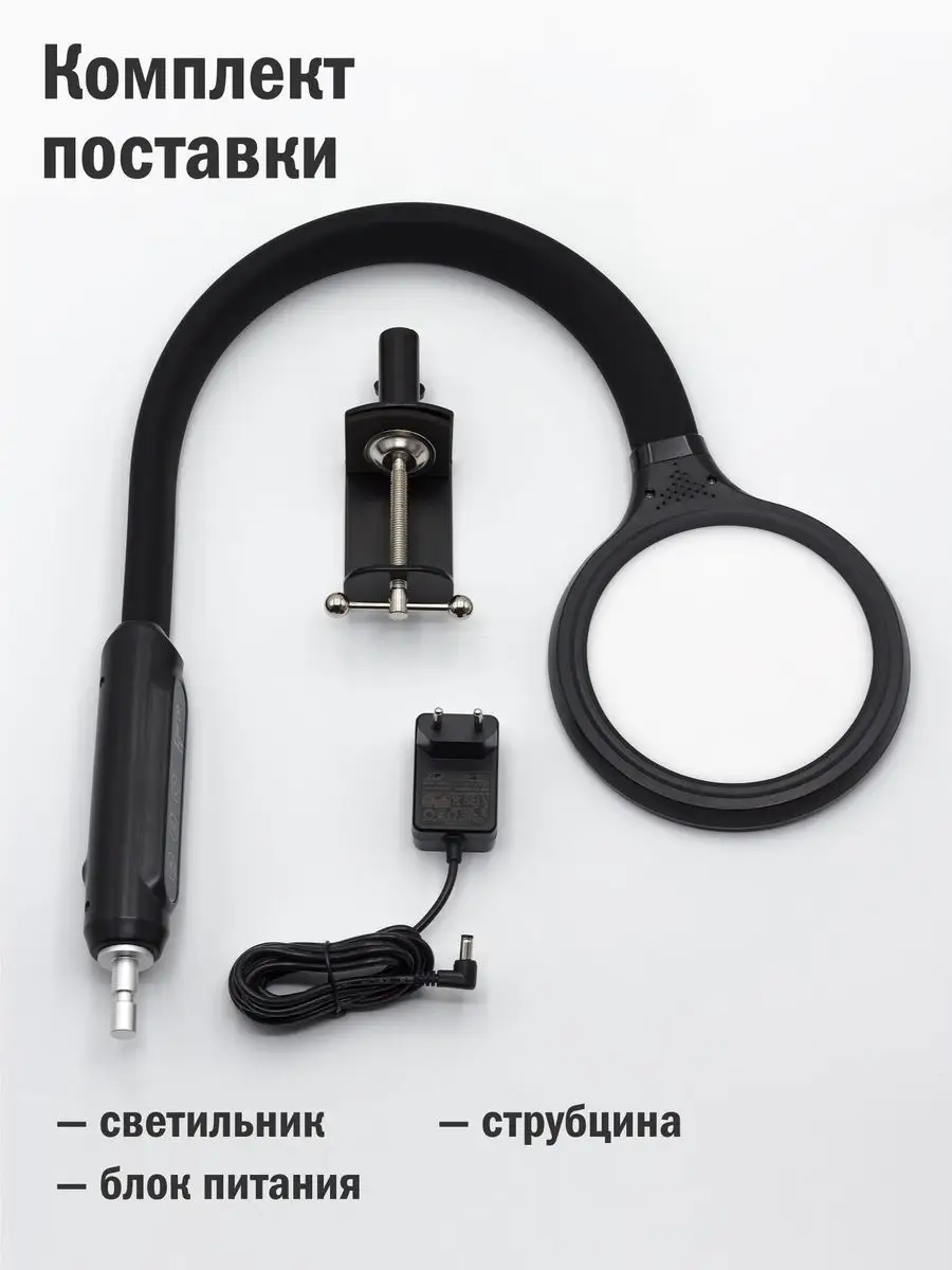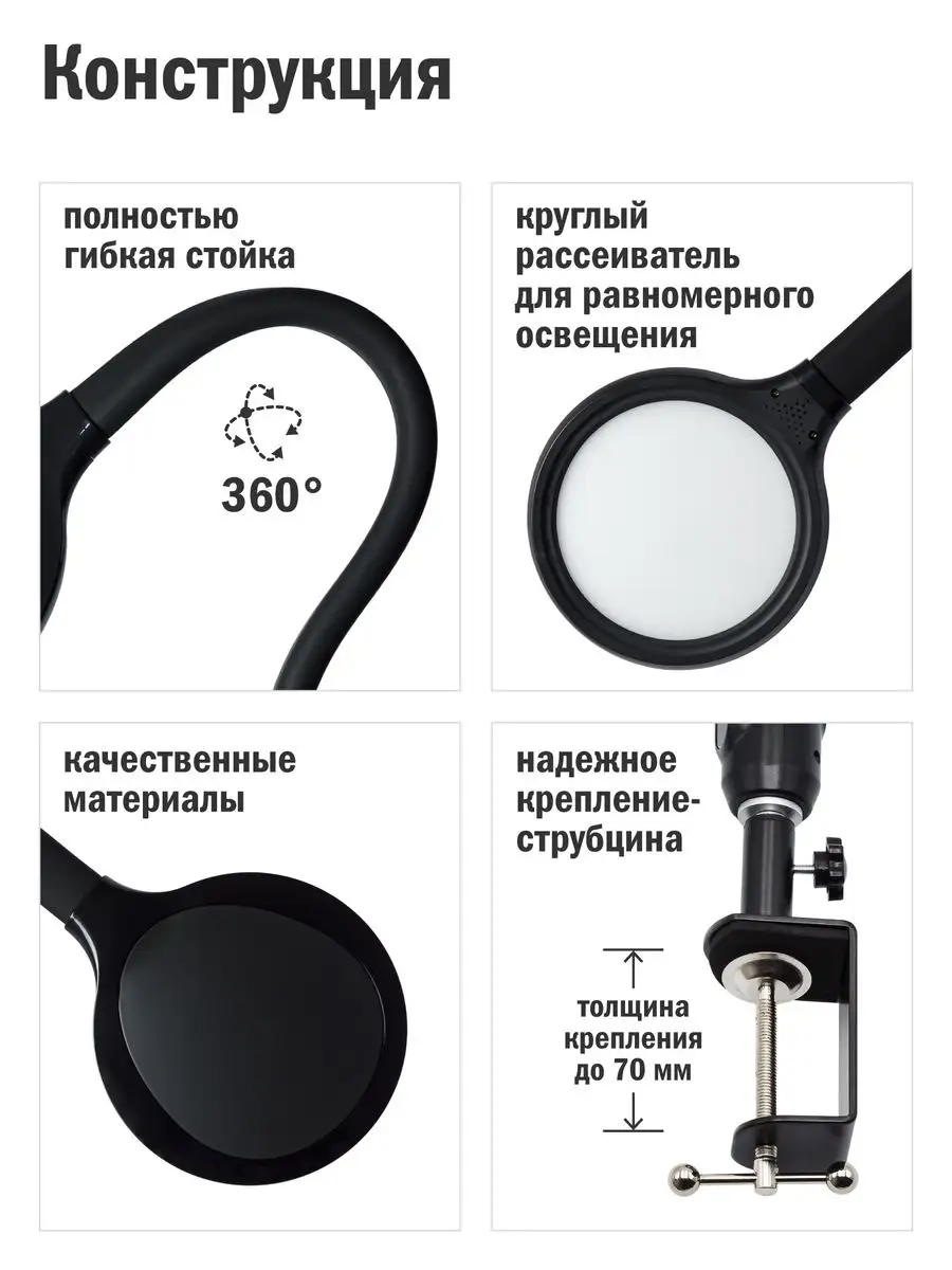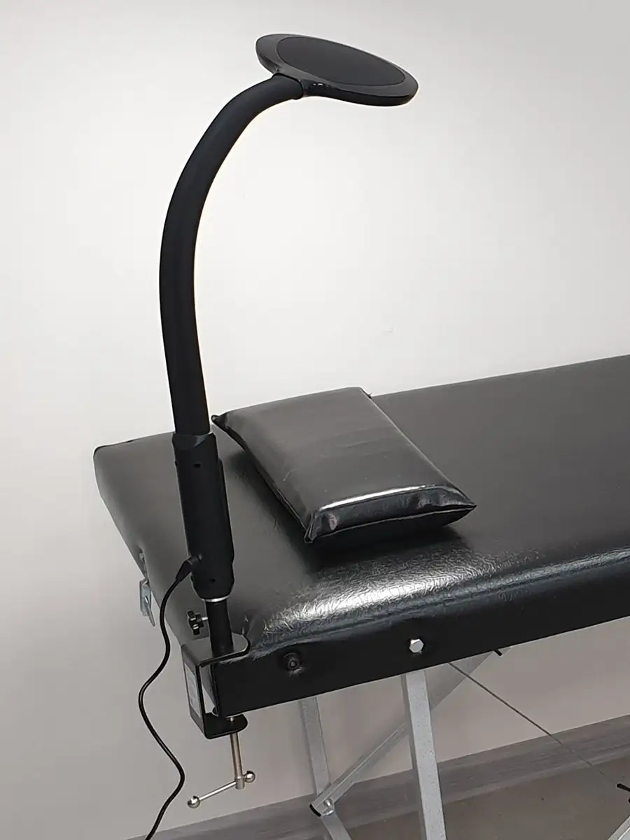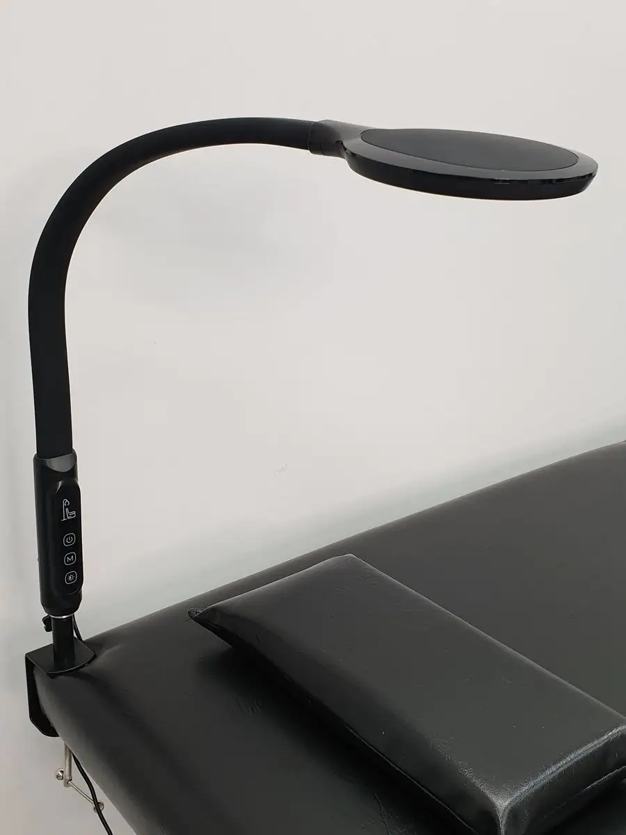 Удобная высокотехнологичная светодиодная лампа для наращивания ресниц, бровиста, косметологическая лампа. Может также использоваться как настольная лампа для школьника, лампа для маникюра и наращивания ногтей, настольная лампа для рабочего места. Безграничные возможности по настройке и регулировке света - можно регулировать степень освещенности и температуру света (10 уровней регулировки). С помощью надежной стальной струбцины лампу можно прикрепить к любой горизонтальной поверхности толщиной до 7 см, в том числе к косметологической кушетке. Гибкая стойка светильника позволяет вращать плафон в любой плоскости.Лампа очень яркая, благодаря использованию современных светодиодов, срок службы которых 30000 часов. Хорошая плотность светового потока (1200 Люменов), большая площадь освещения.**Технические характеристики:**- Мощность - 18 Вт- Световой поток - 1200 лм- Цветовая температура - 2000-6000 К- Срок службы - 30000 ч- Питание вход - 100-240В, 50/60 Гц- Питание выход - 13В/1.3А.