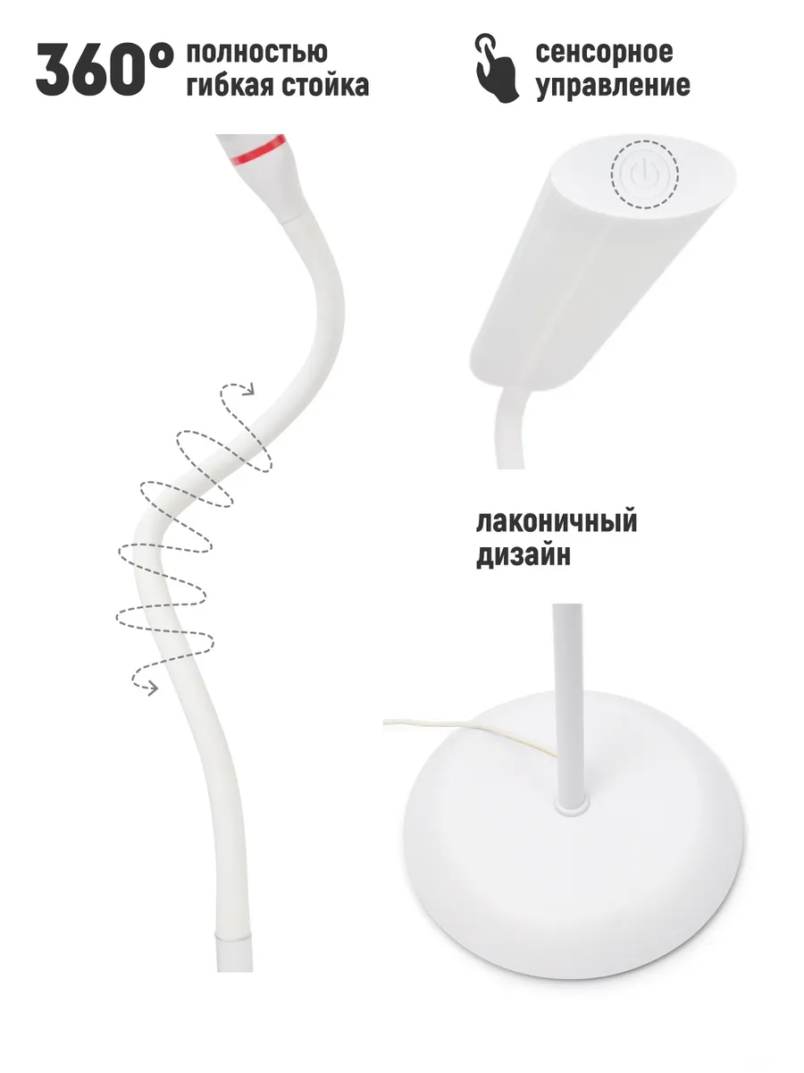 Полностью гибкой стойка - идеально для чтения. Светильник может принимать любую форму, что позволяет настроить направление освещения по своему вкусу и необходимостью. Светильник оснащен простым, интуитивно понятным сенсорным управлением. Отличный подарок на любой праздник мужчине и женщине. Сочетание специально подобранного рассеивателя помогает минимизировать блики и нагрузку на глаза. Он обеспечивает комфорт глаз, устраняя мерцание. Пусть рабочее место станет удобным!