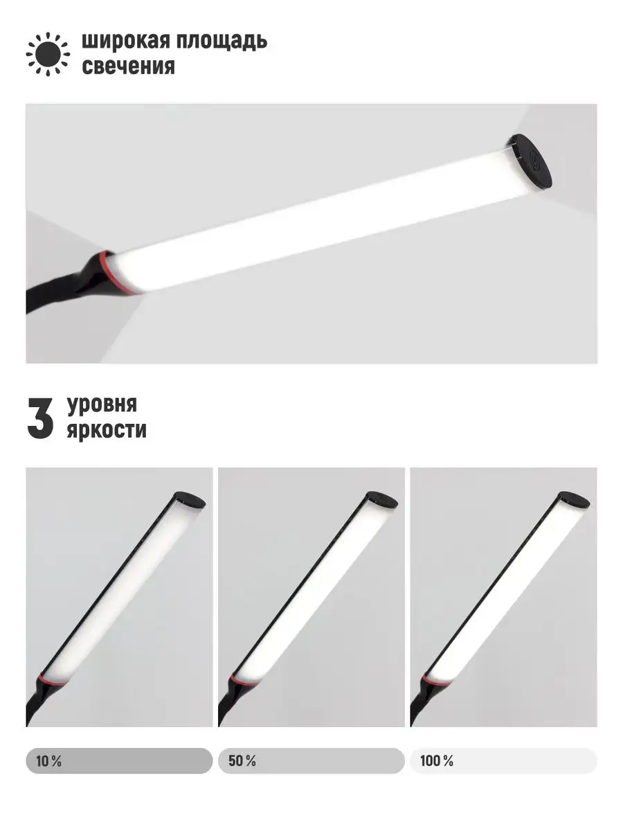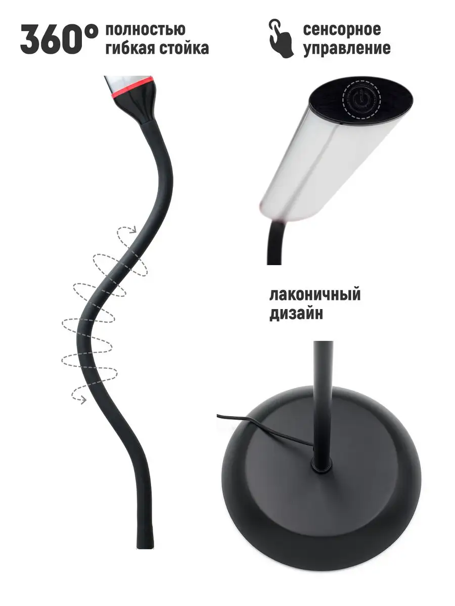 Полностью гибкой стойка - идеально для чтения. Светильник может принимать любую форму, что позволяет настроить направление освещения по своему вкусу и необходимостью. Светильник оснащен простым, интуитивно понятным сенсорным управлением. Отличный подарок на любой праздник мужчине и женщине. Сочетание специально подобранного рассеивателя помогает минимизировать блики и нагрузку на глаза. Он обеспечивает комфорт глаз, устраняя мерцание. Пусть рабочее место станет удобным!