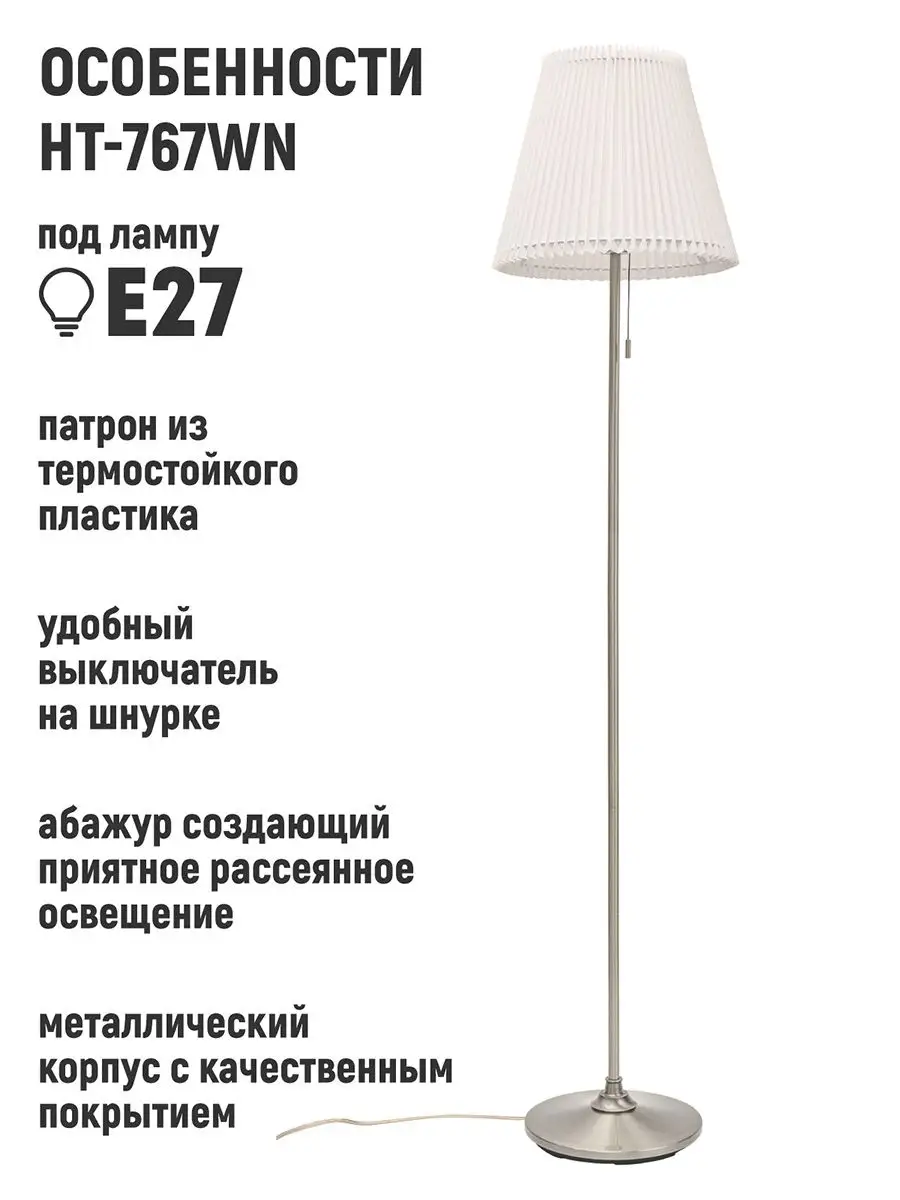 Торшер имеет мощность до 40 Вт, что позволяет создать достаточно яркое освещение в помещении. Лампа с цоколем E27 обеспечивает легкую замену и долгий срок эксплуатации - до 30000 часов.