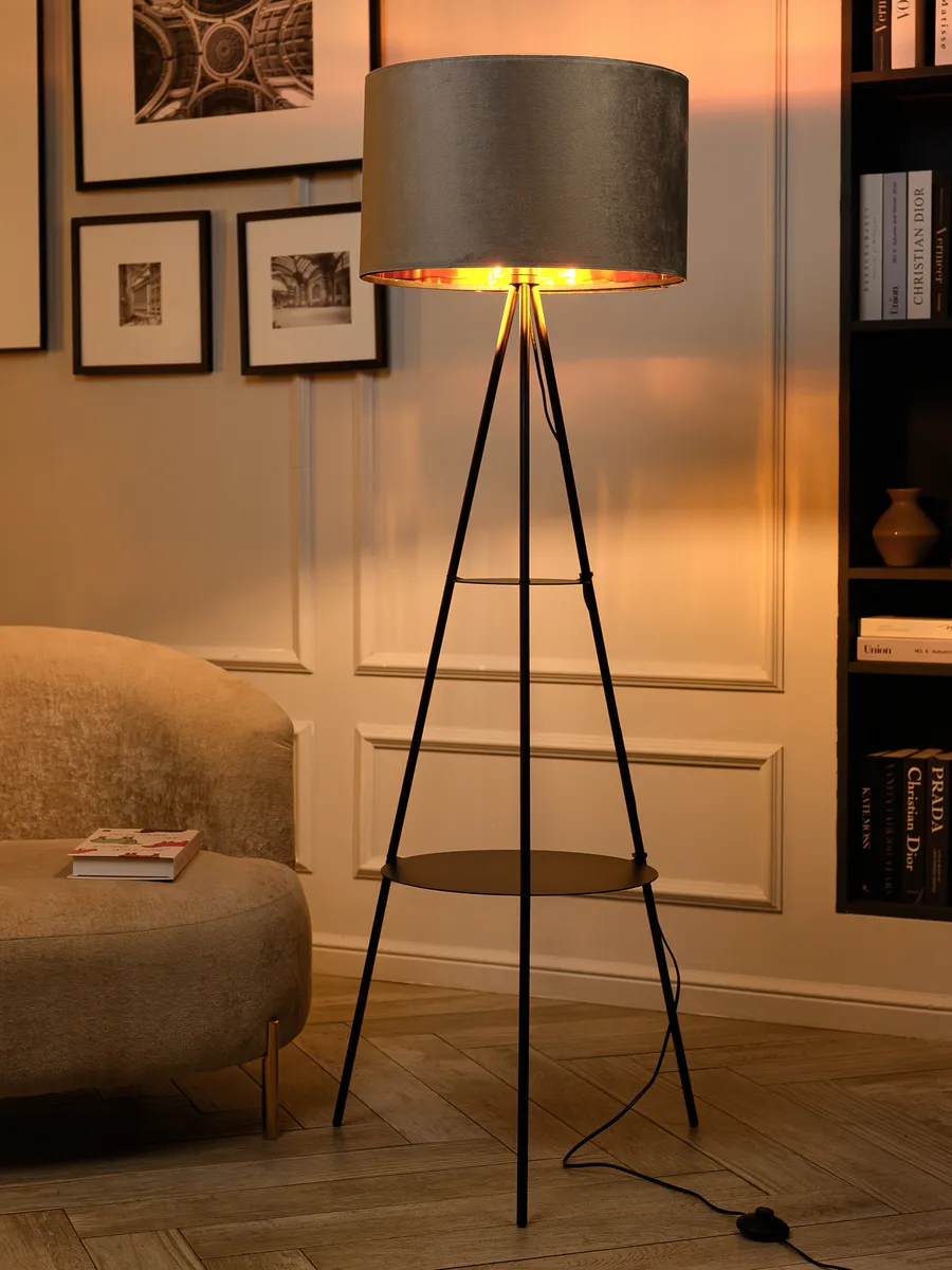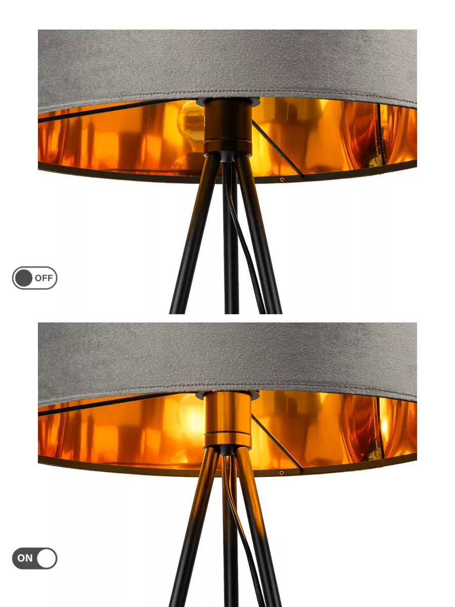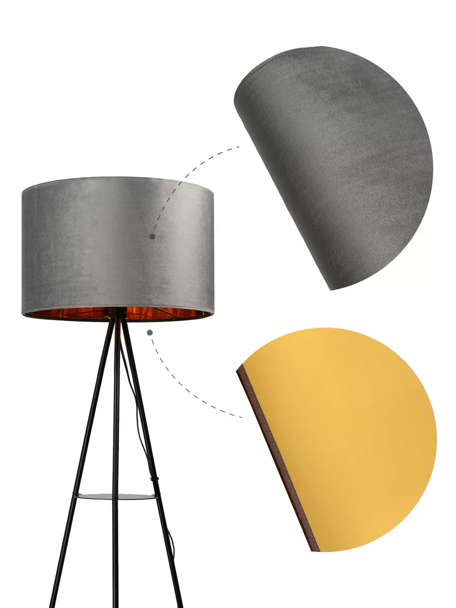 Его современный дизайн с легкостью вписывается как в классический, так и в винтажный интерьер, с нотками элегантности. Металлический каркас торшера, увенчанный текстильным абажуром, создаёт мягкий, рассеянный свет, идеально подходящий для чтения или расслабляющей атмосферы. Внутренняя золотистая поверхность плафона добавляет теплого, уютного свечения.