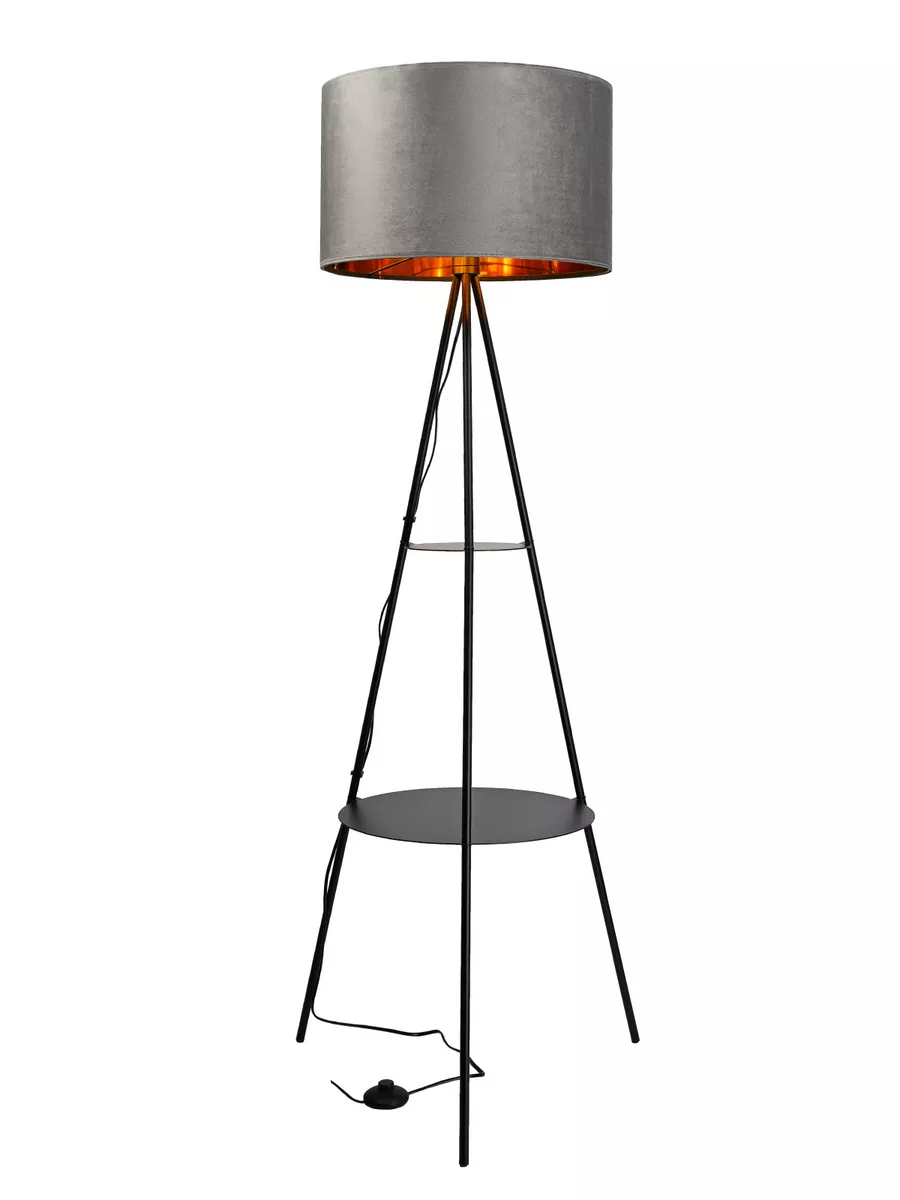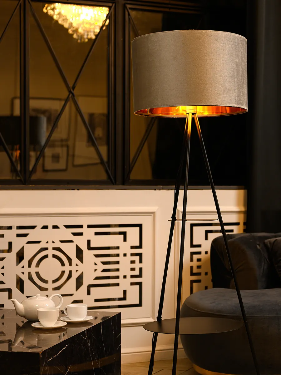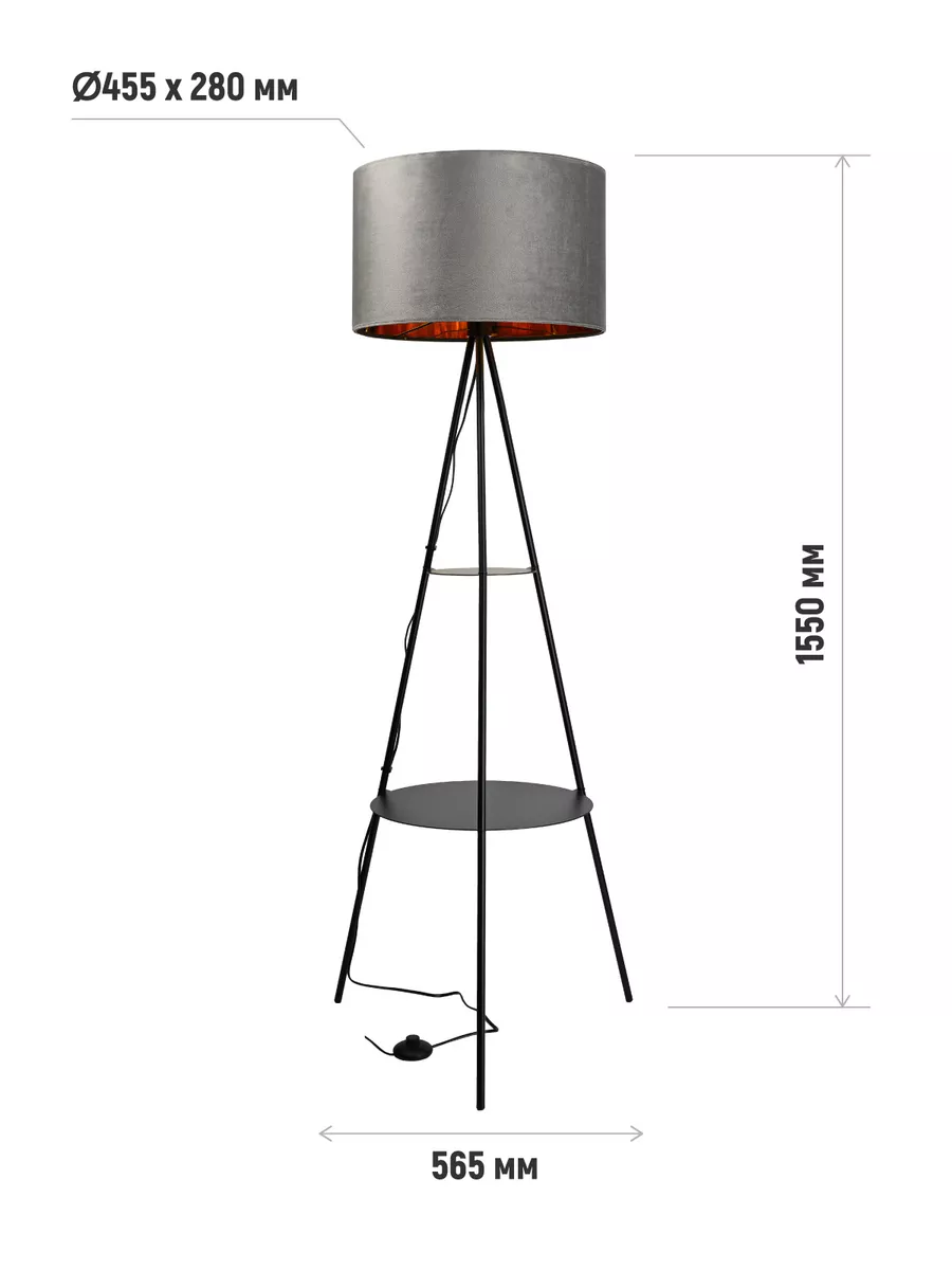 Его современный дизайн с легкостью вписывается как в классический, так и в винтажный интерьер, с нотками элегантности. Металлический каркас торшера, увенчанный текстильным абажуром, создаёт мягкий, рассеянный свет, идеально подходящий для чтения или расслабляющей атмосферы. Внутренняя золотистая поверхность плафона добавляет теплого, уютного свечения.