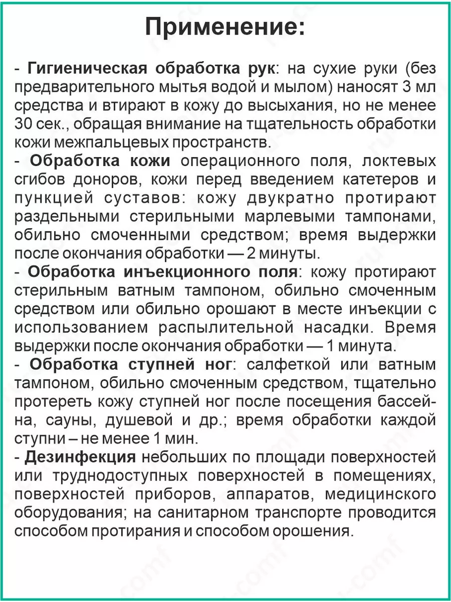 Этот препарат также обладает фунгицидной активностью в отношении грибков рода Candida и дерматофитов. Это делает его идеальным выбором для обработки рук, кожи и других поверхностей, требующих гигиенической обработки.