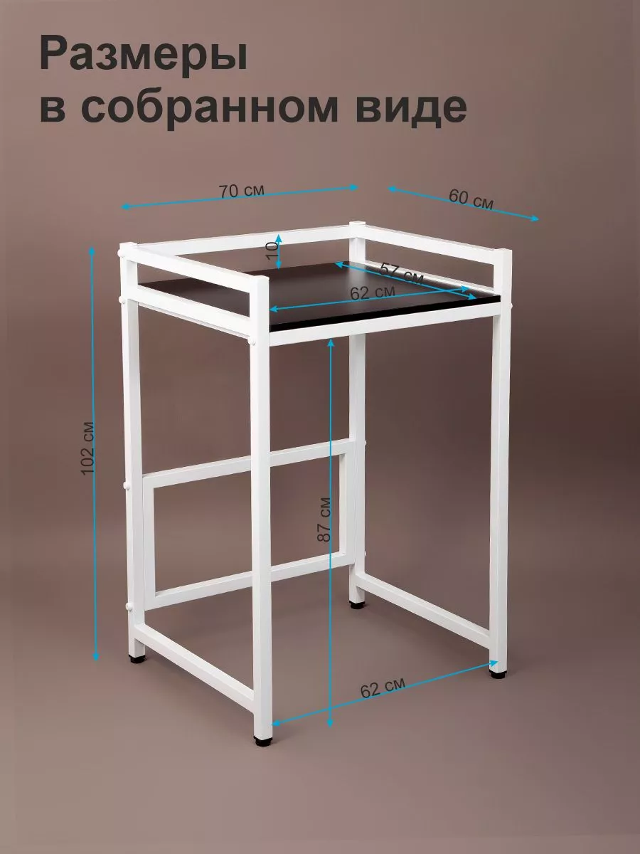 Внешние габариты стойки для стиральной машины: ширина рамы 68 см (70 см по заглушкам болтов), глубина 60 см, высота 102 см. Высота может варьироваться в пределах 1-2 см за счет регулируемых ножек, которые позволяют установить стеллаж на неровной поверхности и отрегулировать его, выбрав наиболее устойчивое положение.