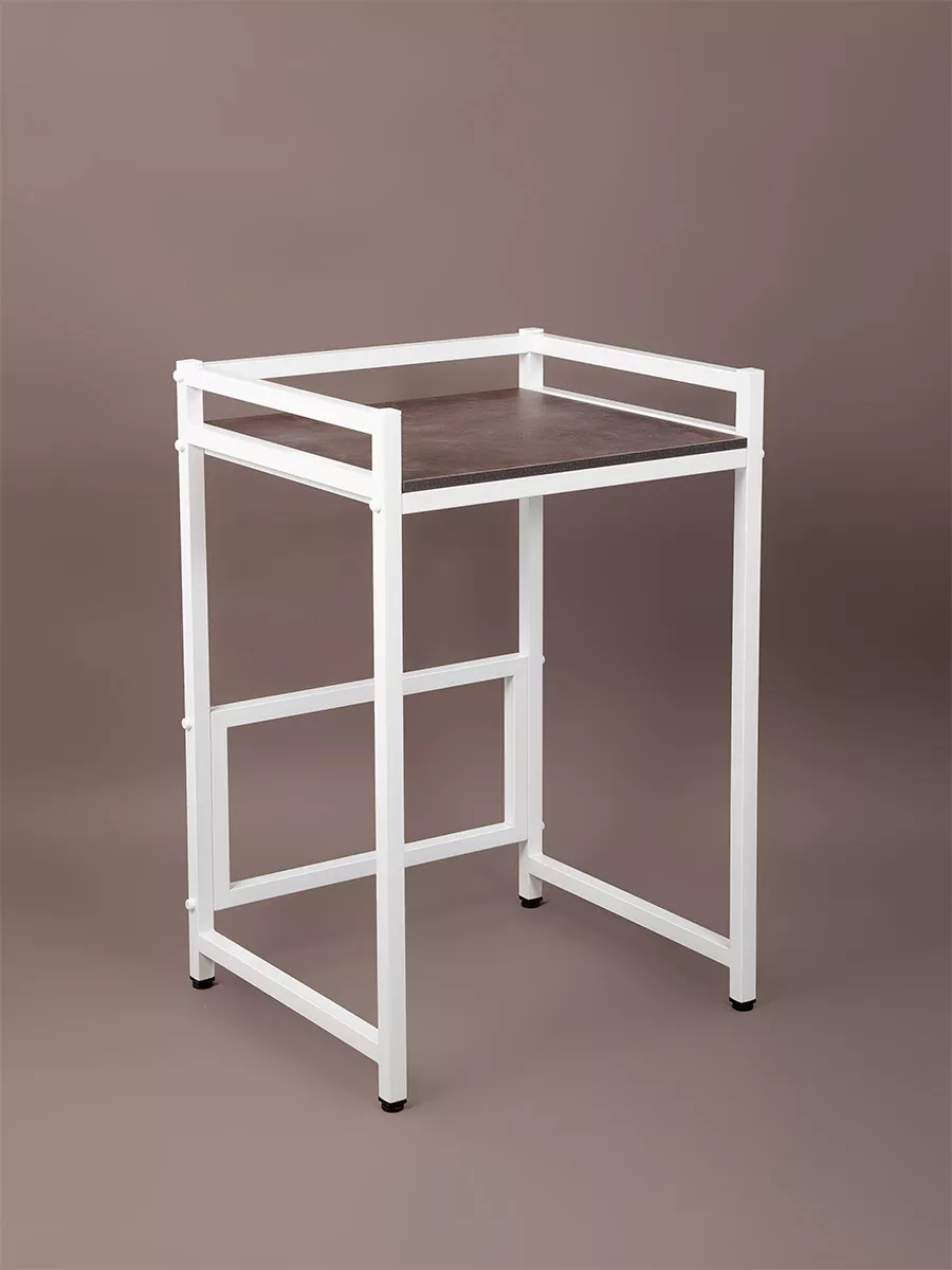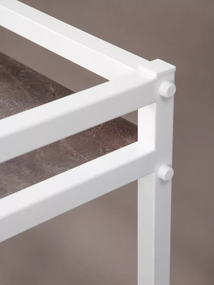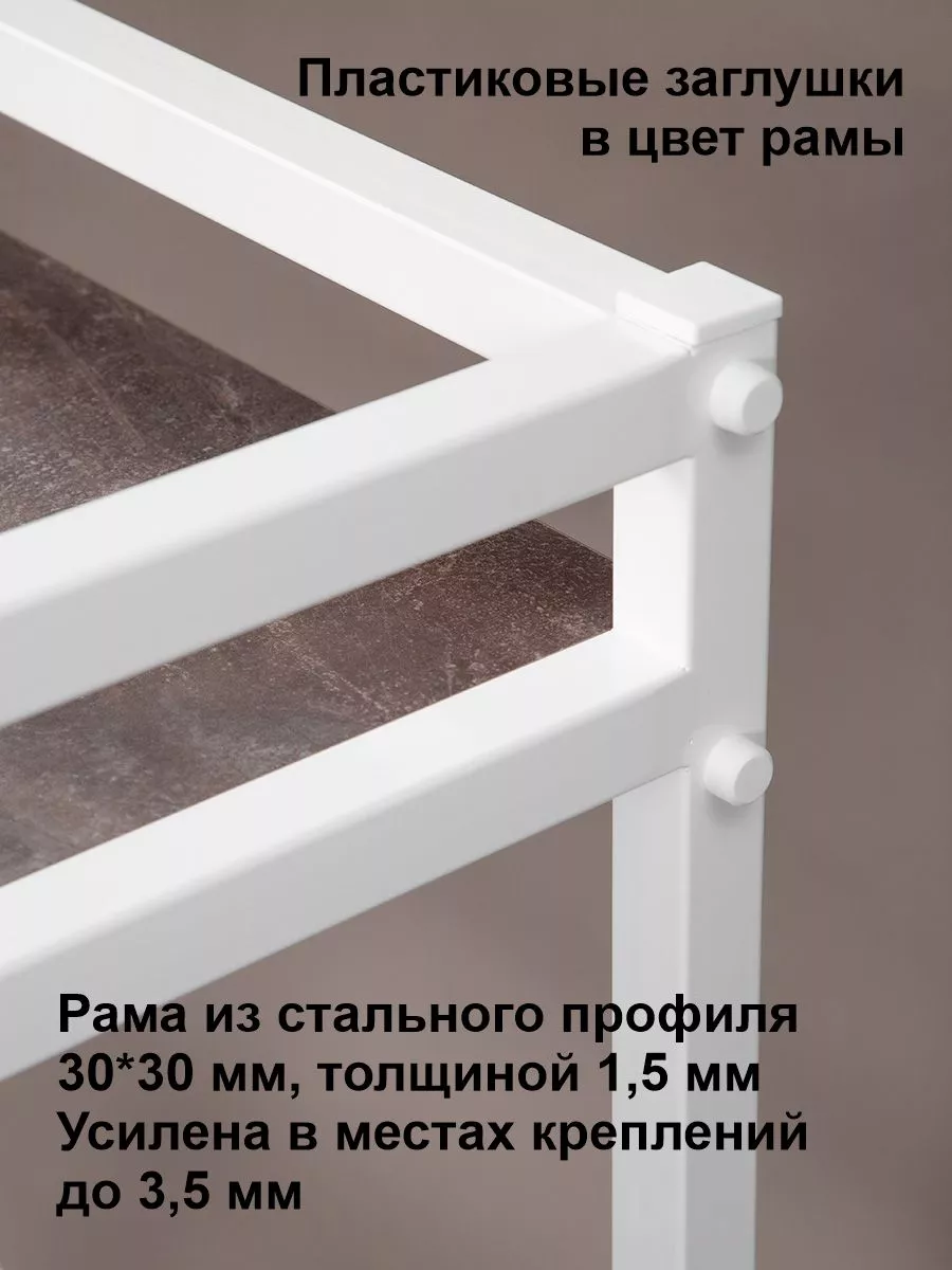 Рама этажерки изготовлена из прочного стального профиля 30*30 мм, с толщиной стенок 1,5 мм. Также в местах креплений стенки профиля усилены шайбами, достигая толщины 3,5 мм. Пластиковые заглушки в цвет корпуса позволяют скрыть элемента крепежа и торцевые части рамы. Стеллаж выглядит красиво и аккуратно!
