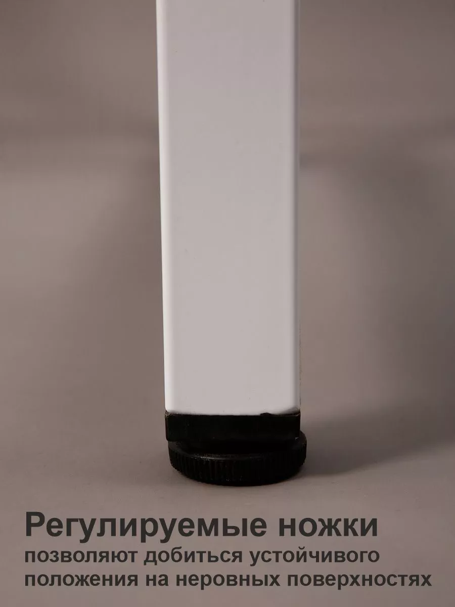 Внешние габариты стойки для стиральной машины: ширина рамы 68 см (70 см по заглушкам болтов), глубина 60 см, высота 102 см. Высота может варьироваться в пределах 1-2 см за счет регулируемых ножек, которые позволяют установить стеллаж на неровной поверхности и отрегулировать его, выбрав наиболее устойчивое положение.