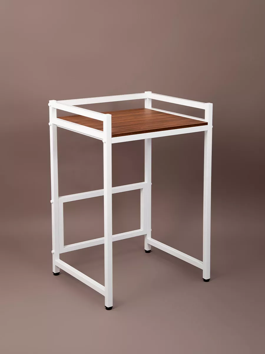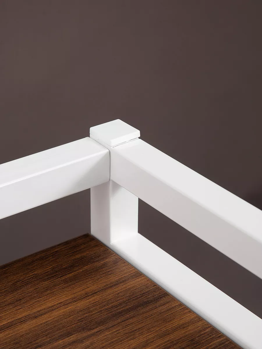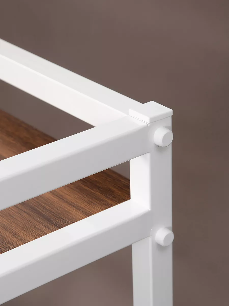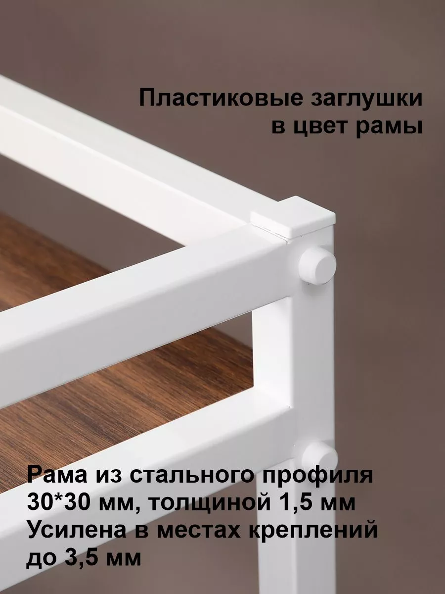 Рама этажерки изготовлена из прочного стального профиля 30*30 мм, с толщиной стенок 1,5 мм. Также в местах креплений стенки профиля усилены шайбами, достигая толщины 3,5 мм. Пластиковые заглушки в цвет корпуса позволяют скрыть элемента крепежа и торцевые части рамы. Стеллаж выглядит красиво и аккуратно!