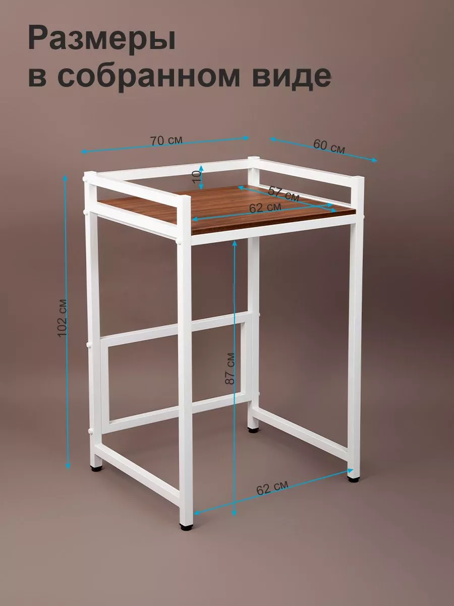 Внешние габариты стойки для стиральной машины: ширина рамы 68 см (70 см по заглушкам болтов), глубина 60 см, высота 102 см. Высота может варьироваться в пределах 1-2 см за счет регулируемых ножек, которые позволяют установить стеллаж на неровной поверхности и отрегулировать его, выбрав наиболее устойчивое положение.
