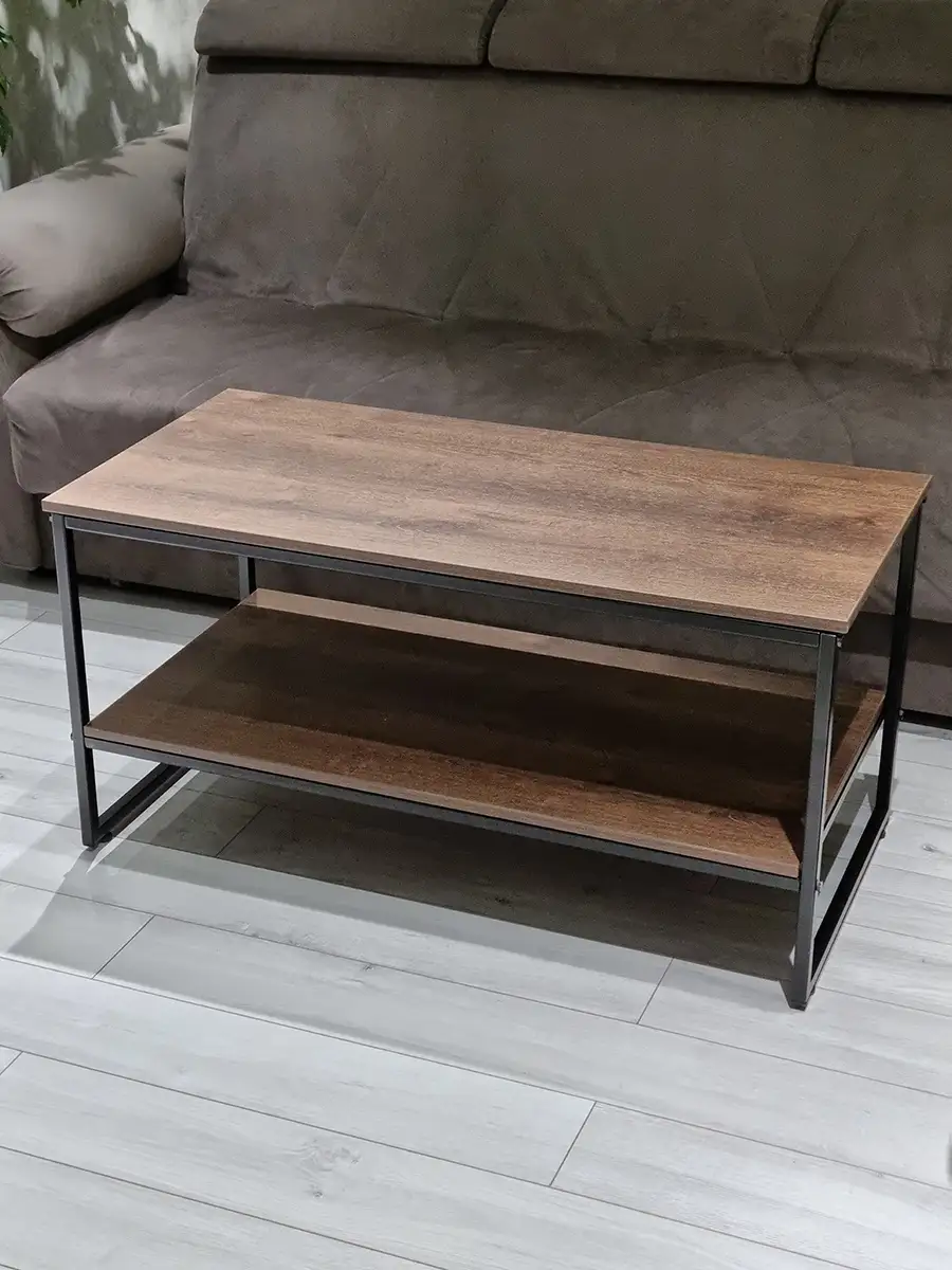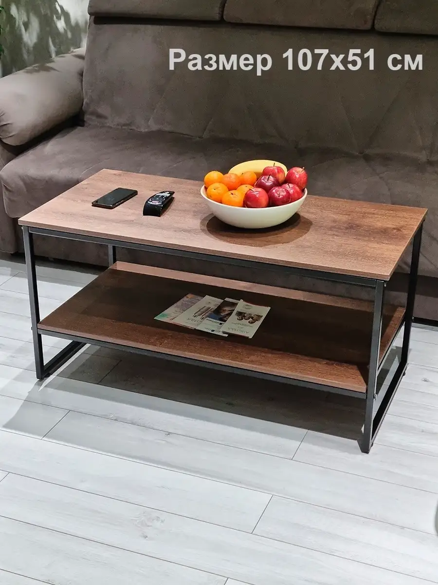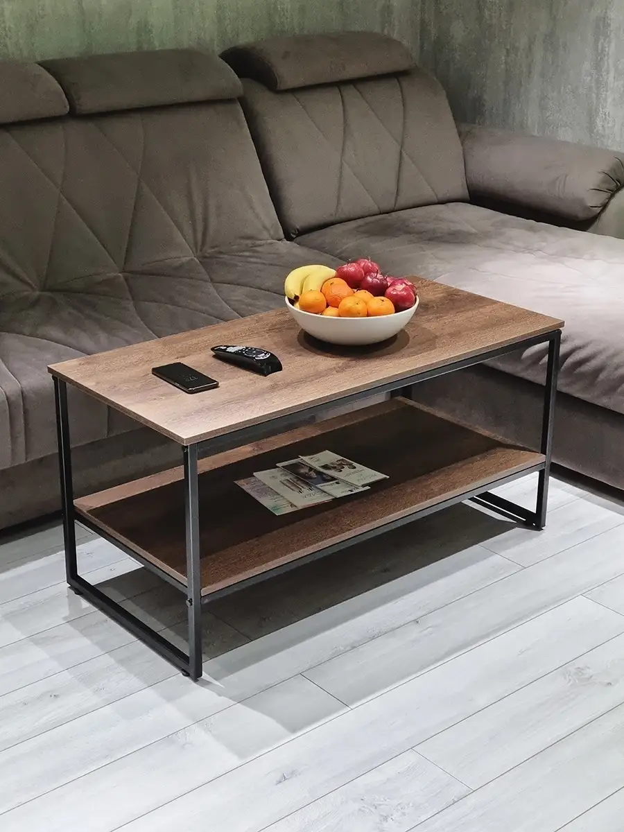 Прямоугольный приставной журнальный столик с полкой в стиле Лофт. Может использоваться как придиванный журнальный стол для ноутбука, столик для лаунж-зоны в отеле, гостинице, кофейный столик для кафе, бара, ресторана, для кофейни. Основа стола изготовлена из стального профиля 20х20 мм, с покрытием черный глянец, выполненным по технологии порошкового окрашивания. Такое покрытие устойчиво к коррозии, сколам, царапинам. Крышка стола и полка изготовлены из ламинированного ДСП толщиной 16 мм, края обработаны ПВХ кромкой толщиной 2 мм. Размер столешницы 107х51 см. Столик опирается на пластиковые регулируемые ножки, которые не царапаю покрытие пола и позволяют установить стол на неровной поверхности. Благодаря продуманной конструкцию и использованию надежных материалов стол выдерживает нагрузку до 200 кг. Столик поставляется в разобранном виде. Инструкция прилагается. Собсвенное производство, Россия. Колесики для стола приобретаются отдельно, артикул 84626075