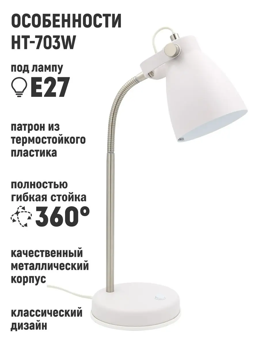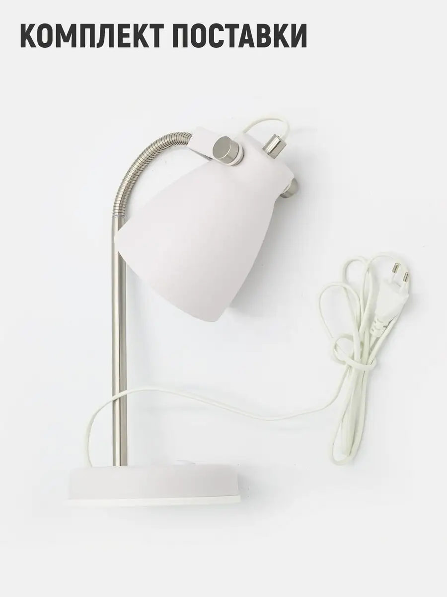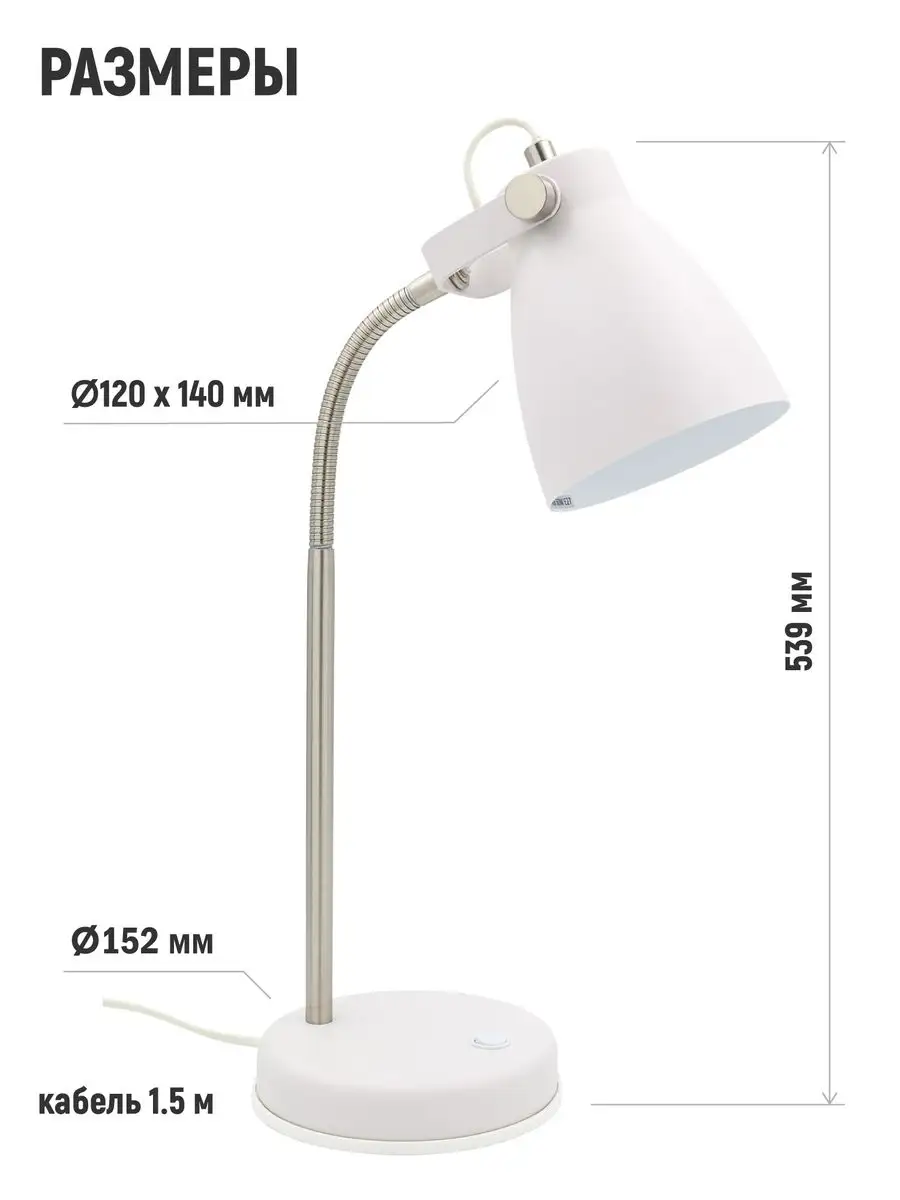 Настольный светильник с вращающимся плафоном и подвижной верхней частью. Лампа создает отличное направленное освещение, а подвижная верхняя часть позволить сфокусировать свет в нужном направлении. Стиль лампы позволит его использовать классическом интерьере и интерьерах лофт. Можно использовать на рабочем столе, парте школьника, учебном столе. Цоколь Е27 позволит подобрать лампу с цветом подходящим под Ваше основное освещение. Элегантность, сдержанные но красивые формы, будут отличным дополнением Вашего интерьера. А возможность вращать подвижную часть светильника делает его удобным в регулировках положения, что позволит регулировать свет на рабочем пространстве. Корпус и аксессуары светильника выполнены из металла, делает его крепким и надёжным. Включение и выключение светильника осуществляется с помощью тумблера расположенного на проводе. Высота лампы 53,9 см, длина провода 1.5 м. Диаметр плафона 12 см, длина 14см.
