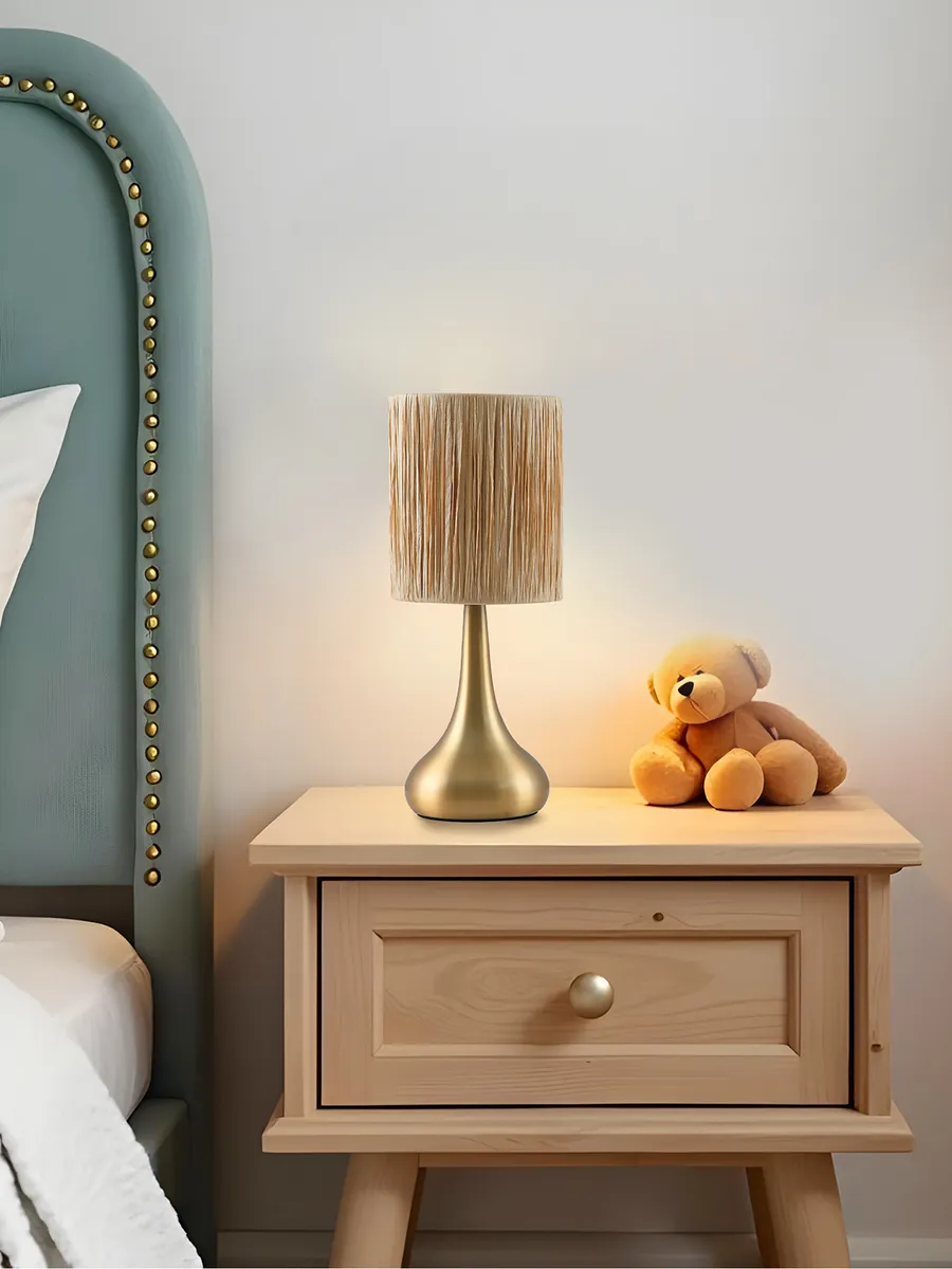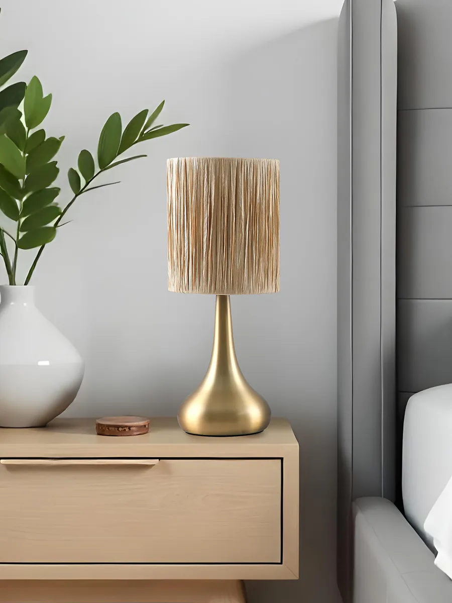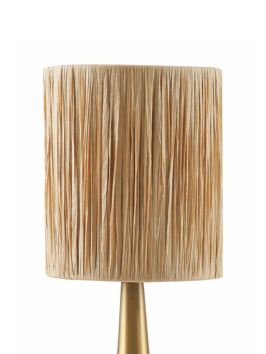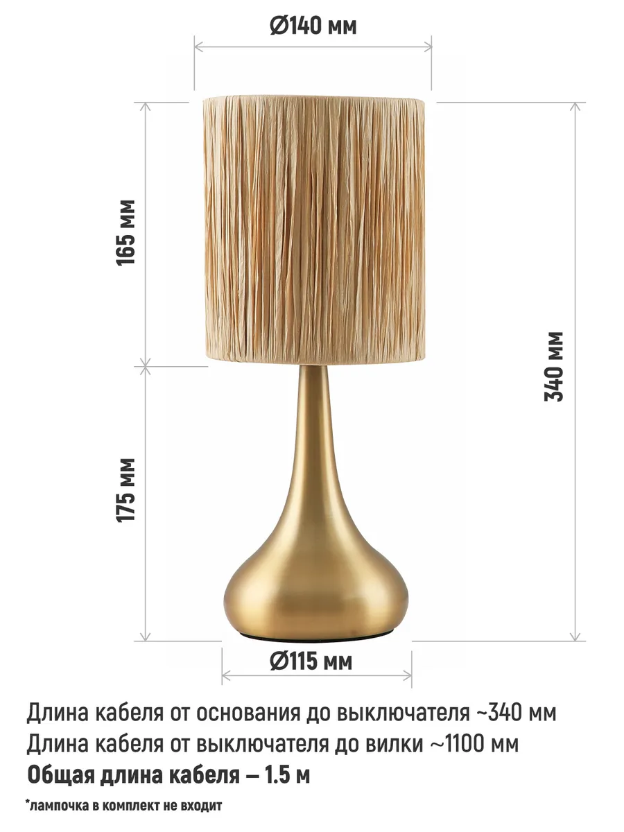 Абажур изготовлен из стилизованной бумаги, имитирующей рафию - волокна пальмовых листьев. Плафон имеет размеры 14х16 см, размер подставки 17.5х11.5 см.