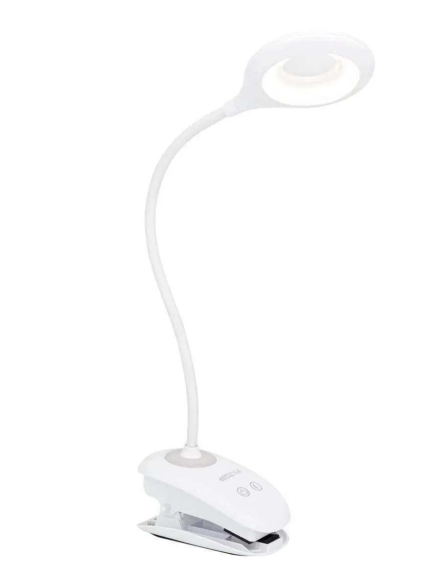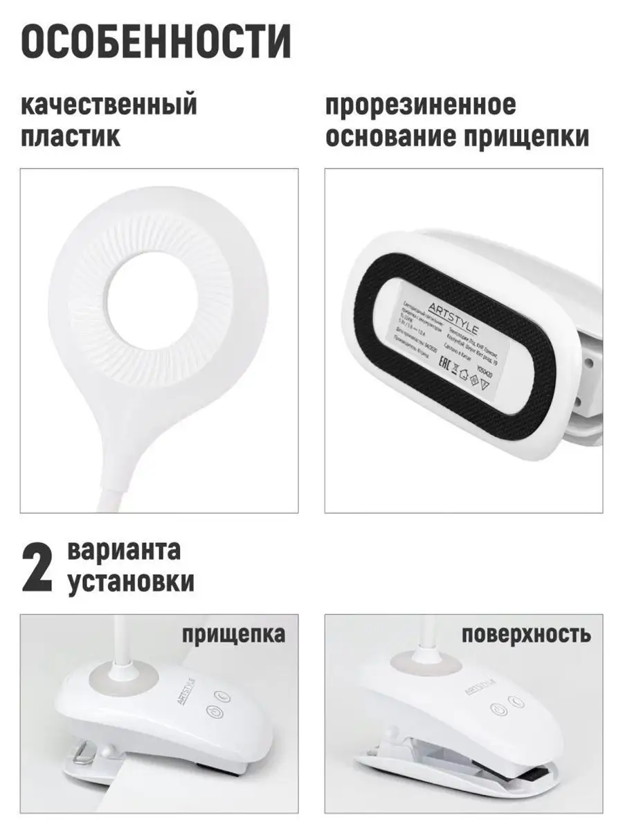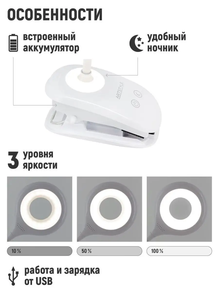 Лампа-ночник настольная светодиодная с аккумулятором на прищепке для школьника, чтения, прикроватная холодного дневного света (4000K). Светильник-ночник можно использовать как от сети, так и как беспроводной светильник. Заряда аккумулятора в режиме ночника хватает на одну ночь, в режиме светильника для чтения - около 1 часа. Гибкая стойка позволяет менять направление света по вашему вкусу. Высокотехнологичный светильник Artstyle (Артстайл) TL-224 имеет сенсорное, интуитивно понятное управление. В основание светильника интегрирован дополнительный источник света, который может выполнять роль ночника. Может использоваться как светильник ночник детский для сна, в офис, лампа для чтения в детскую комнату, прикроватный диодный светильник для чтения. Отличный подарок ребенку, школьнику на 1 сентября День знаний, 1 июня День защиты детей; подарок на 23 февраля, 8 марта, подарок на день рождения, Новый год, Рождество, 14 февраля, новоселье, профессиональный праздник.