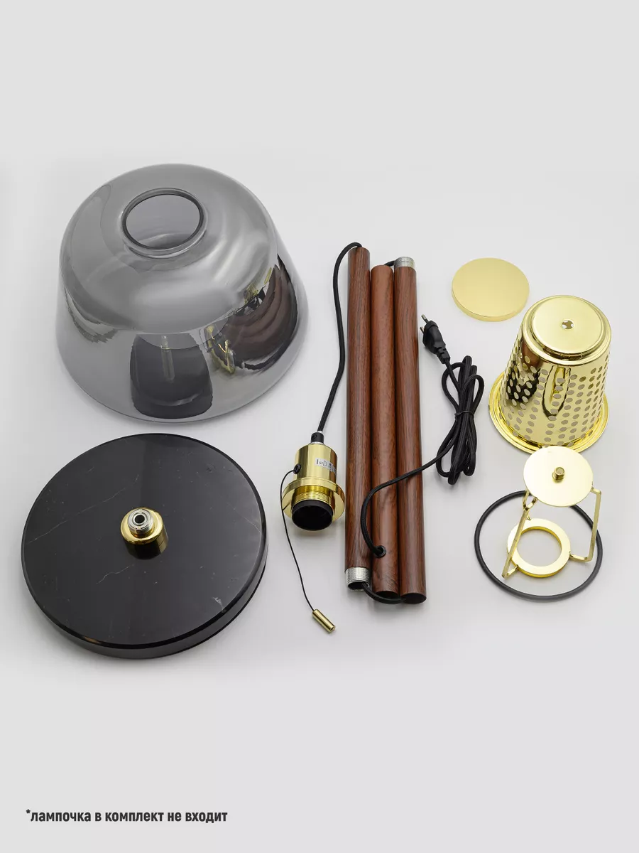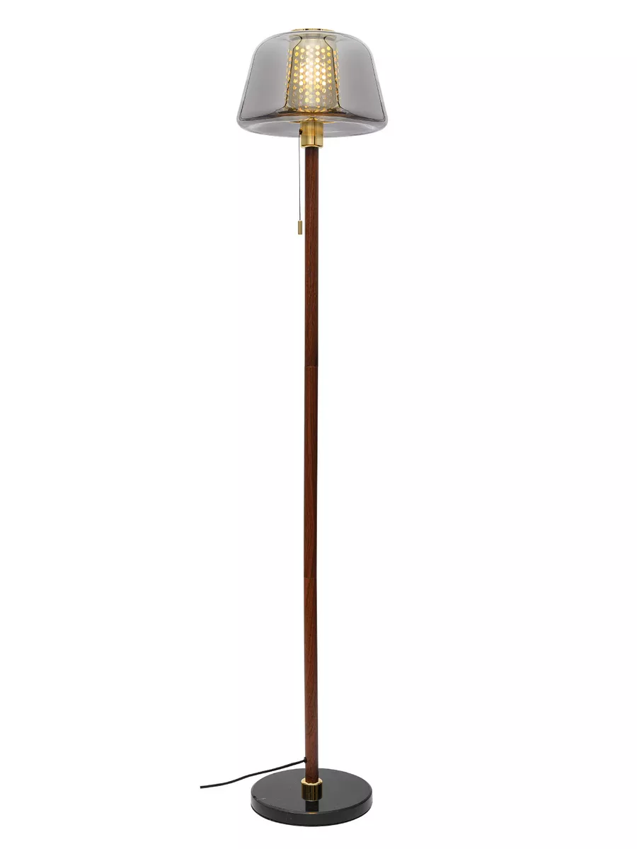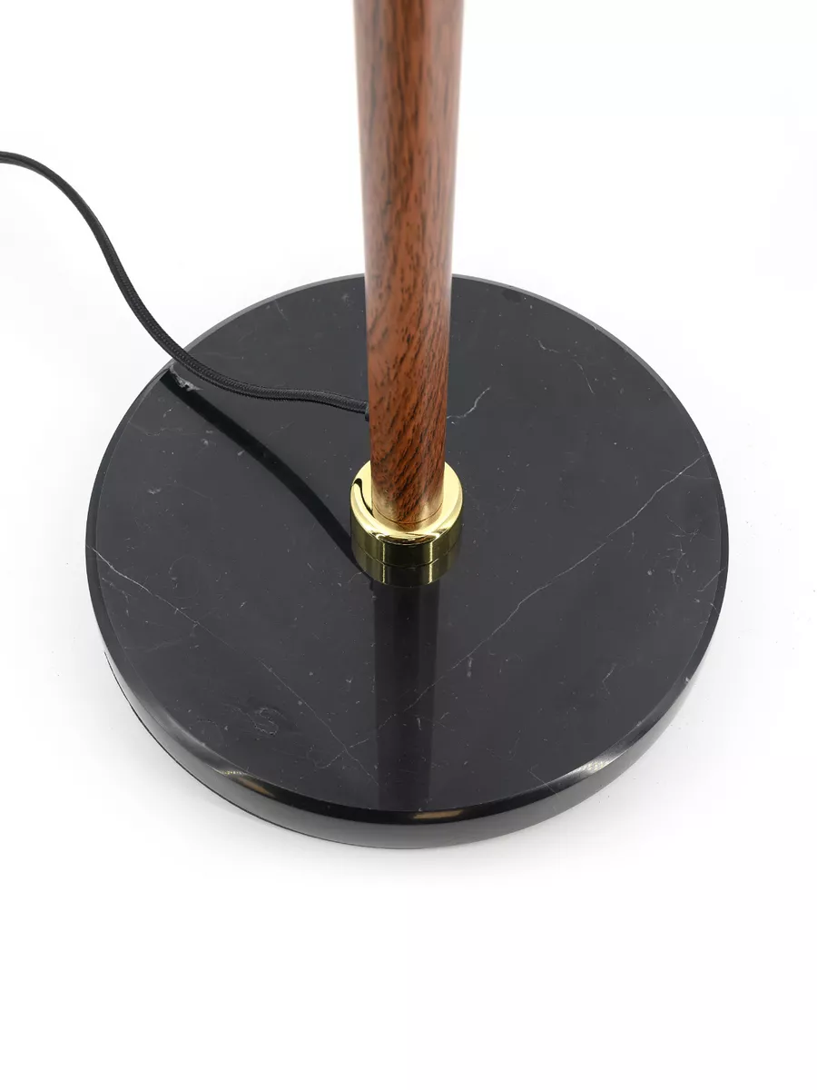 Металлический стойка с имитацией дерева в сочетании с мраморным основанием и стеклянным плафоном,