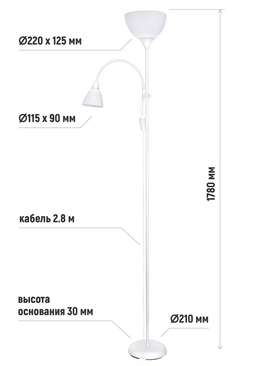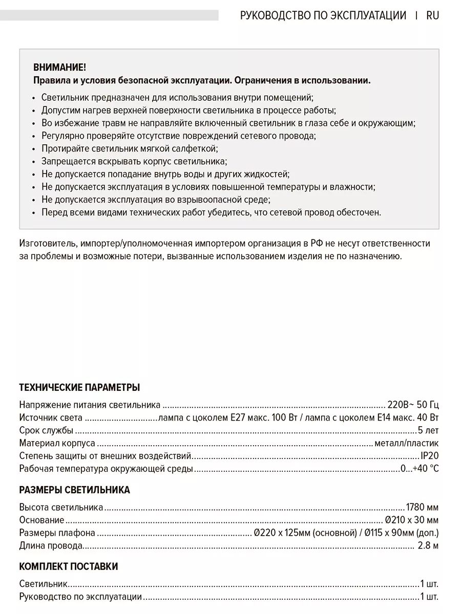 Светильник имеет длительный срок службы 5 лет и степень защиты IP20, что обеспечивает долговечность и безопасность. Продукт изготовлен из металла и пластика, высотой 178 см, размер основания 21 см на 3 см, размер верхнего плафона 22см на 12.5 см и нижнего 11.5 на 9 см.