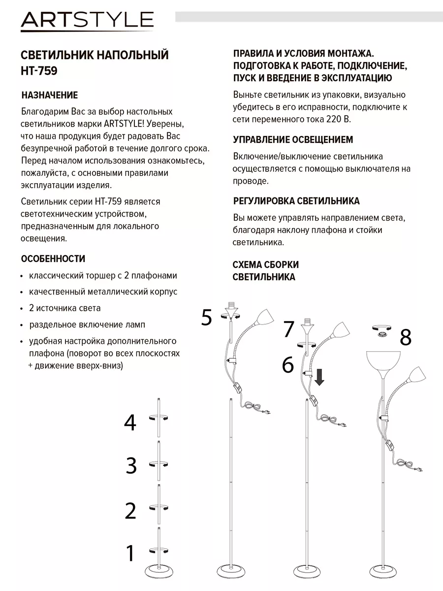 Светильник оснащен двумя источниками света и удобным механическим выключателем на проводе для на каждую лумпу, обеспечивающей максимальный контроль света и гибкость управления.