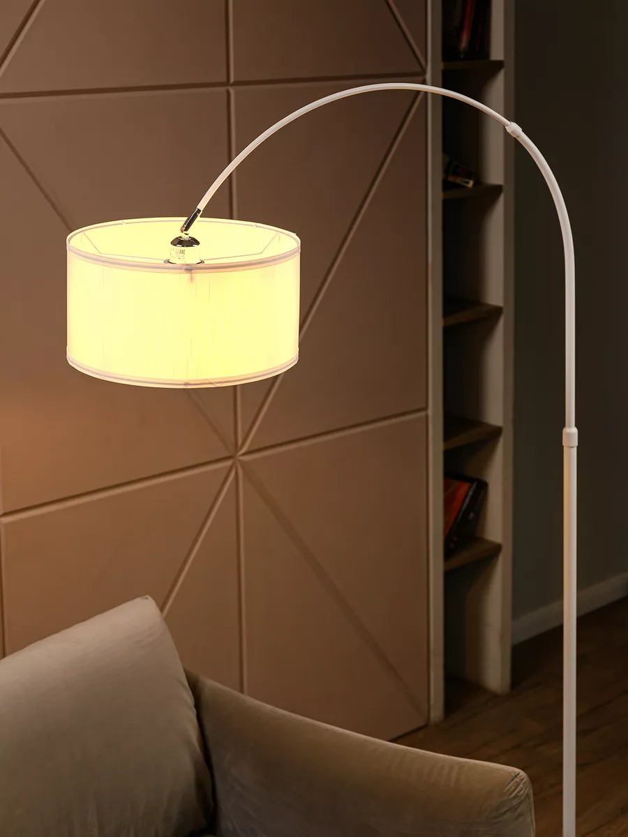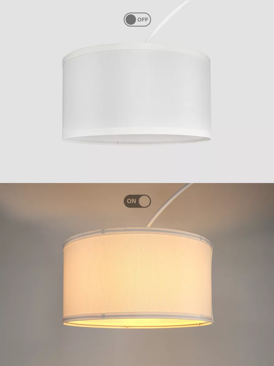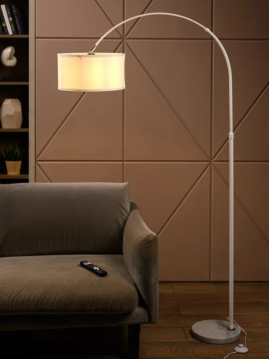 Торшер оснащён просторным тканевым абажуром, который мягко рассеивает свет, создавая уютную атмосферу в комнате. Его текстильная отделка привносит в интерьер тепло и комфорт, гармонично сочетаясь с различными стилями — от минимализма до индустриального. Высота абажура регулируется в диапазоне 145-170 см.