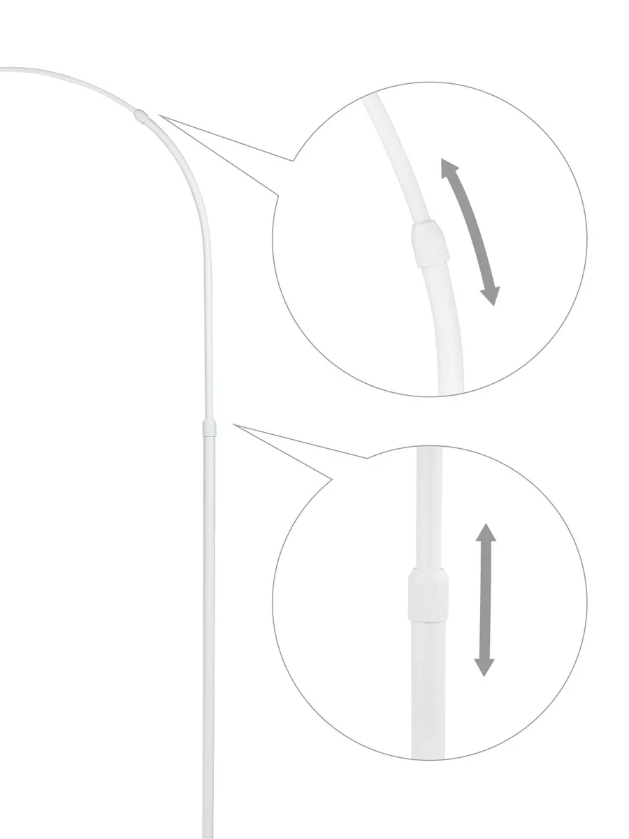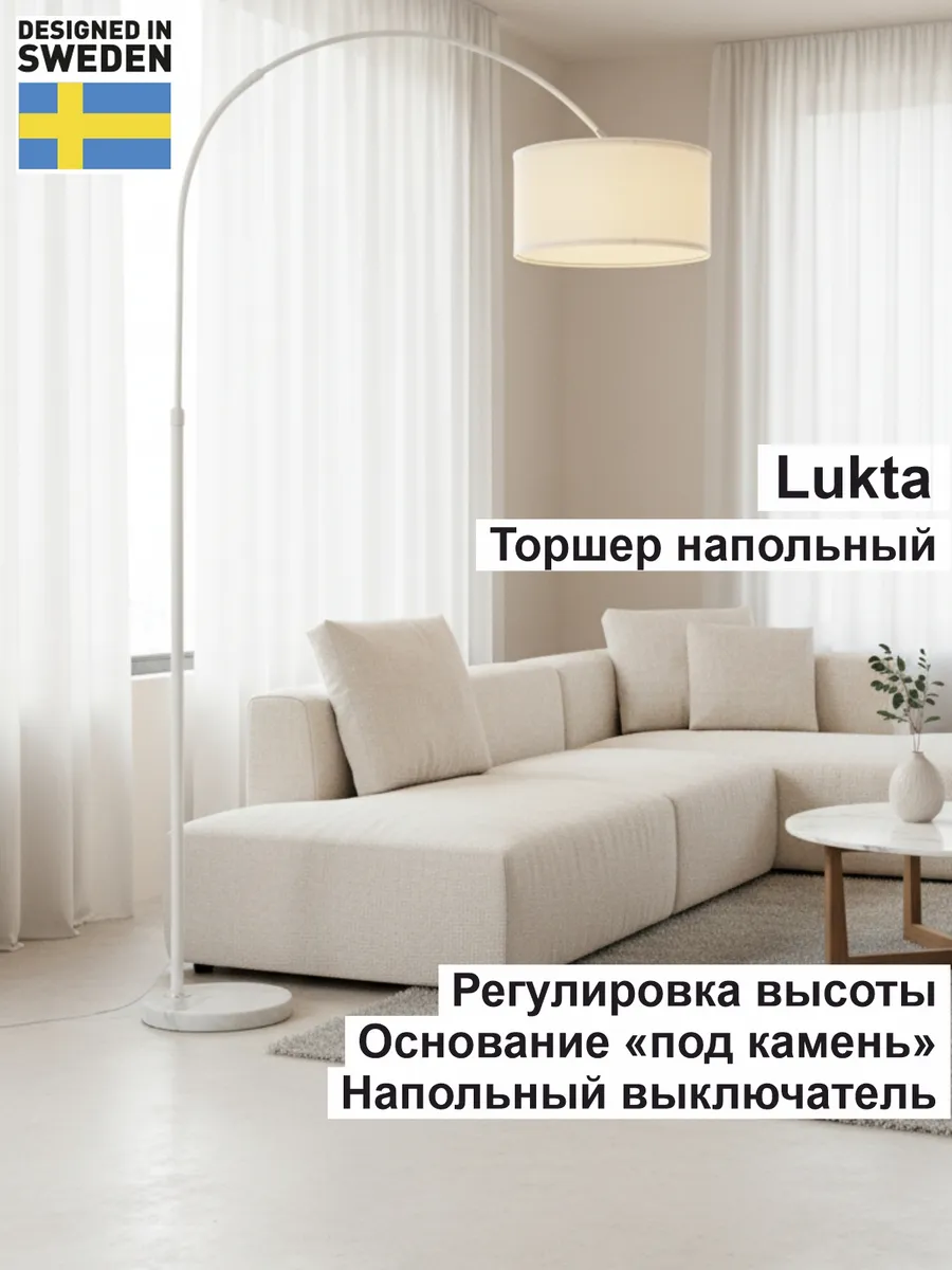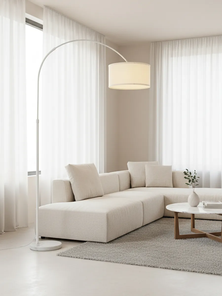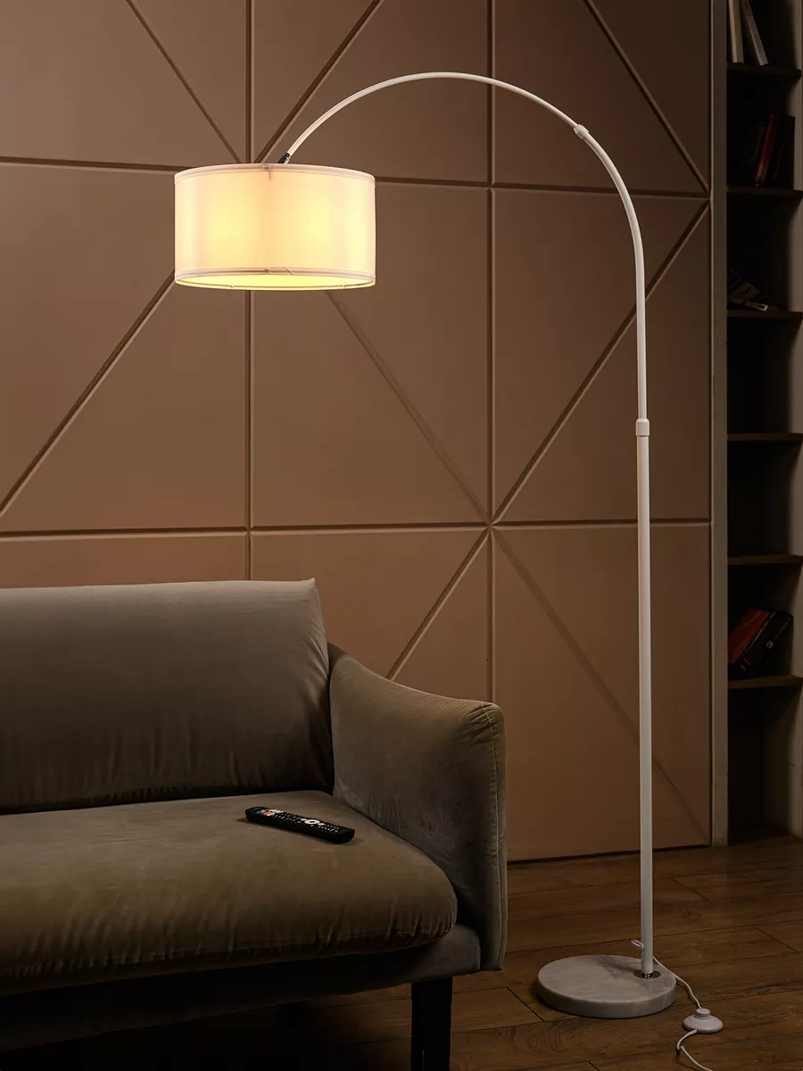 Торшер оснащён просторным тканевым абажуром, который мягко рассеивает свет, создавая уютную атмосферу в комнате. Его текстильная отделка привносит в интерьер тепло и комфорт, гармонично сочетаясь с различными стилями — от минимализма до индустриального. Высота абажура регулируется в диапазоне 145-170 см.