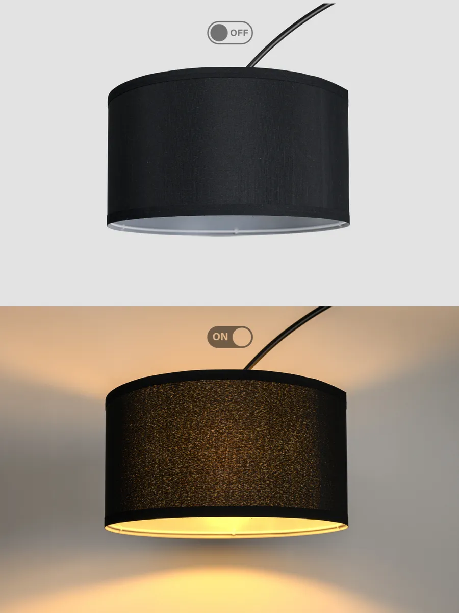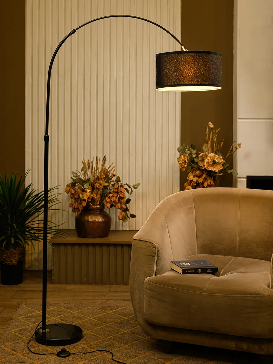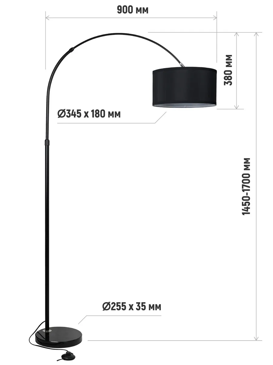 Торшер оснащён просторным тканевым абажуром, который мягко рассеивает свет, создавая уютную атмосферу в комнате. Его текстильная отделка привносит в интерьер тепло и комфорт, гармонично сочетаясь с различными стилями — от минимализма до индустриального. Высота абажура регулируется в диапазоне 145-170 см.