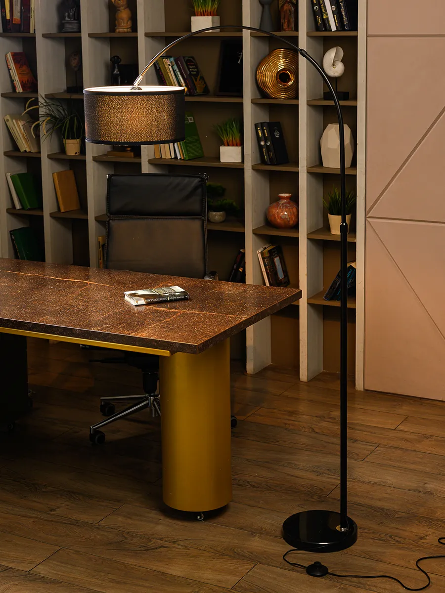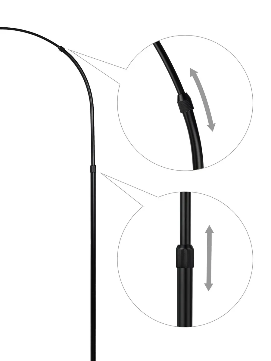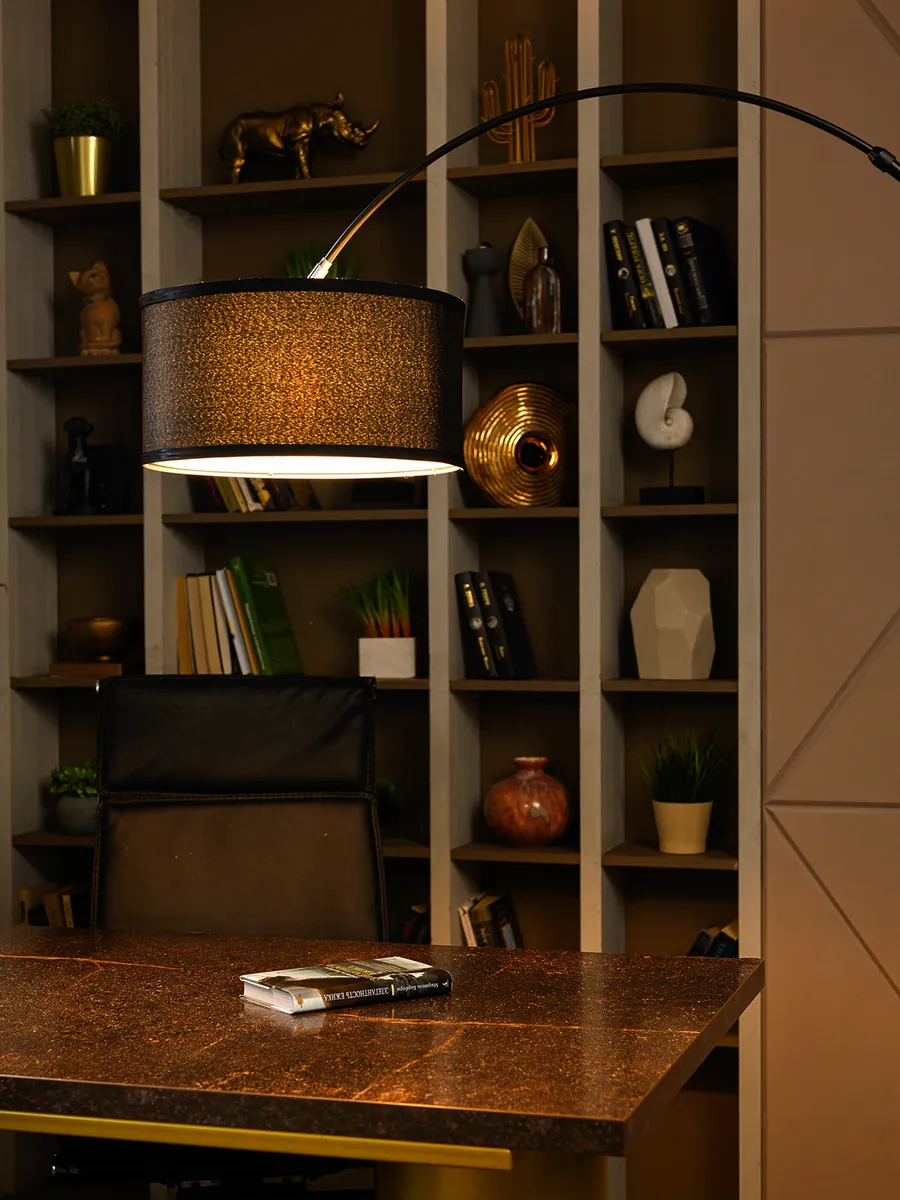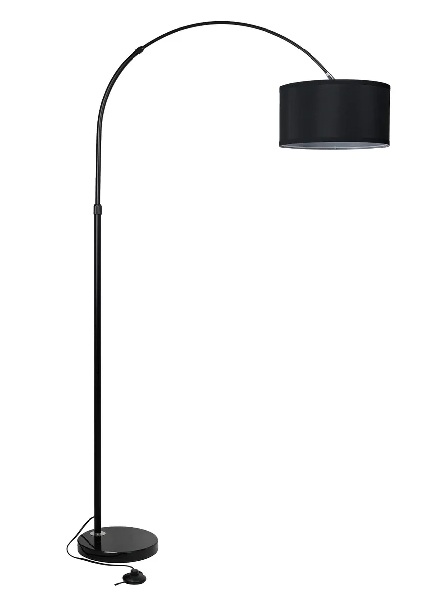 Торшер оснащён просторным тканевым абажуром, который мягко рассеивает свет, создавая уютную атмосферу в комнате. Его текстильная отделка привносит в интерьер тепло и комфорт, гармонично сочетаясь с различными стилями — от минимализма до индустриального. Высота абажура регулируется в диапазоне 145-170 см.