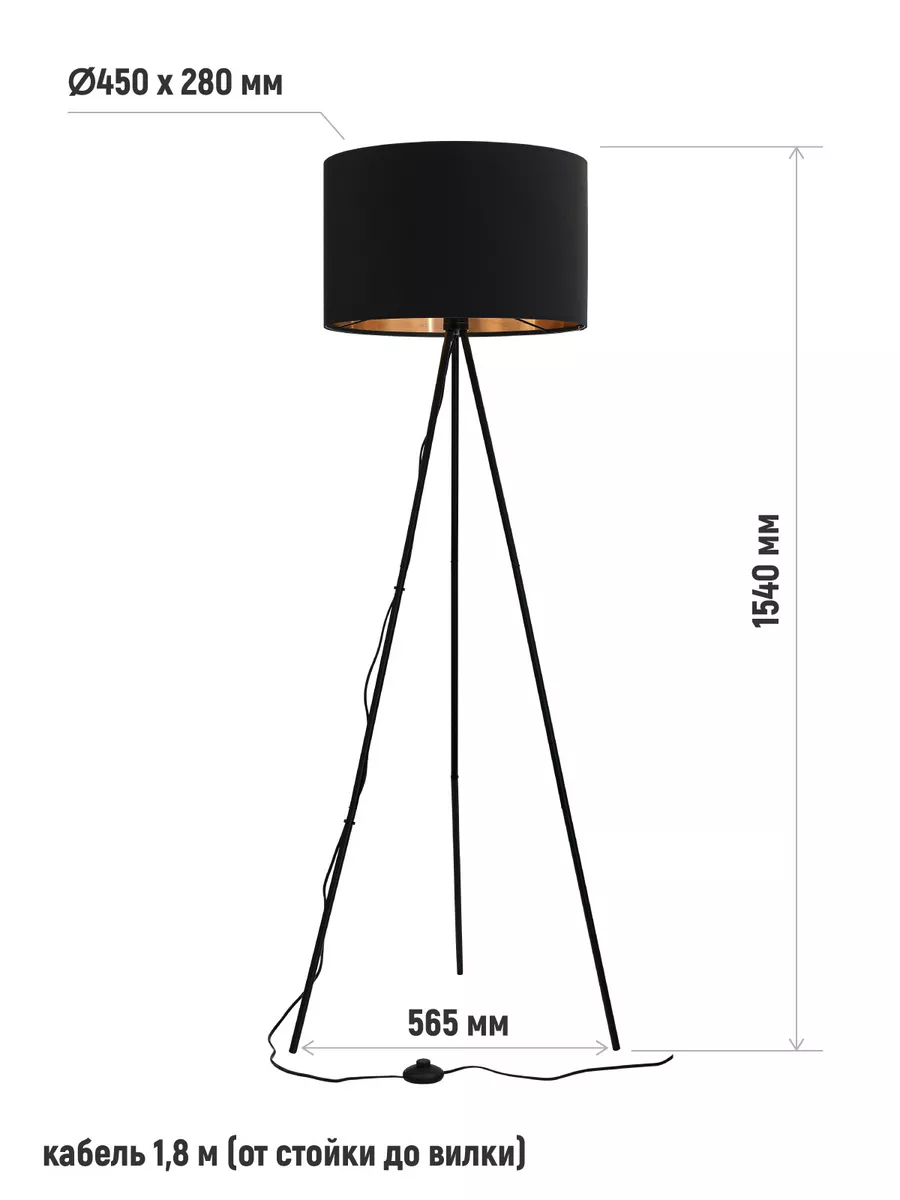Светильник имеет высоту 154 см, ширину между ножек 56.5 см, а диаметр плафона 45 см с высотой 28 см. длинна кабеля 1.8 (от стойки до вилки). Цоколь Е27, патрон из термостойкого пластика,
