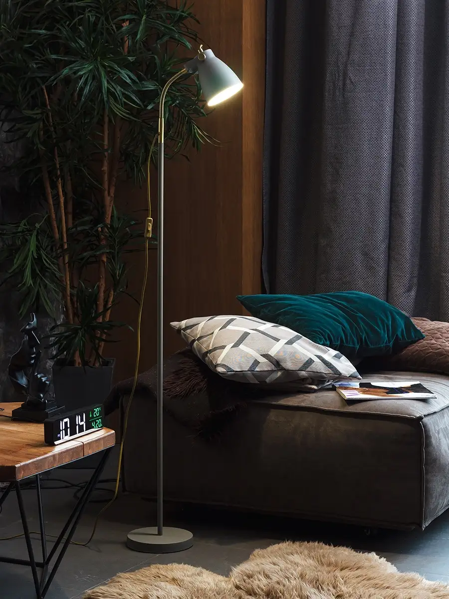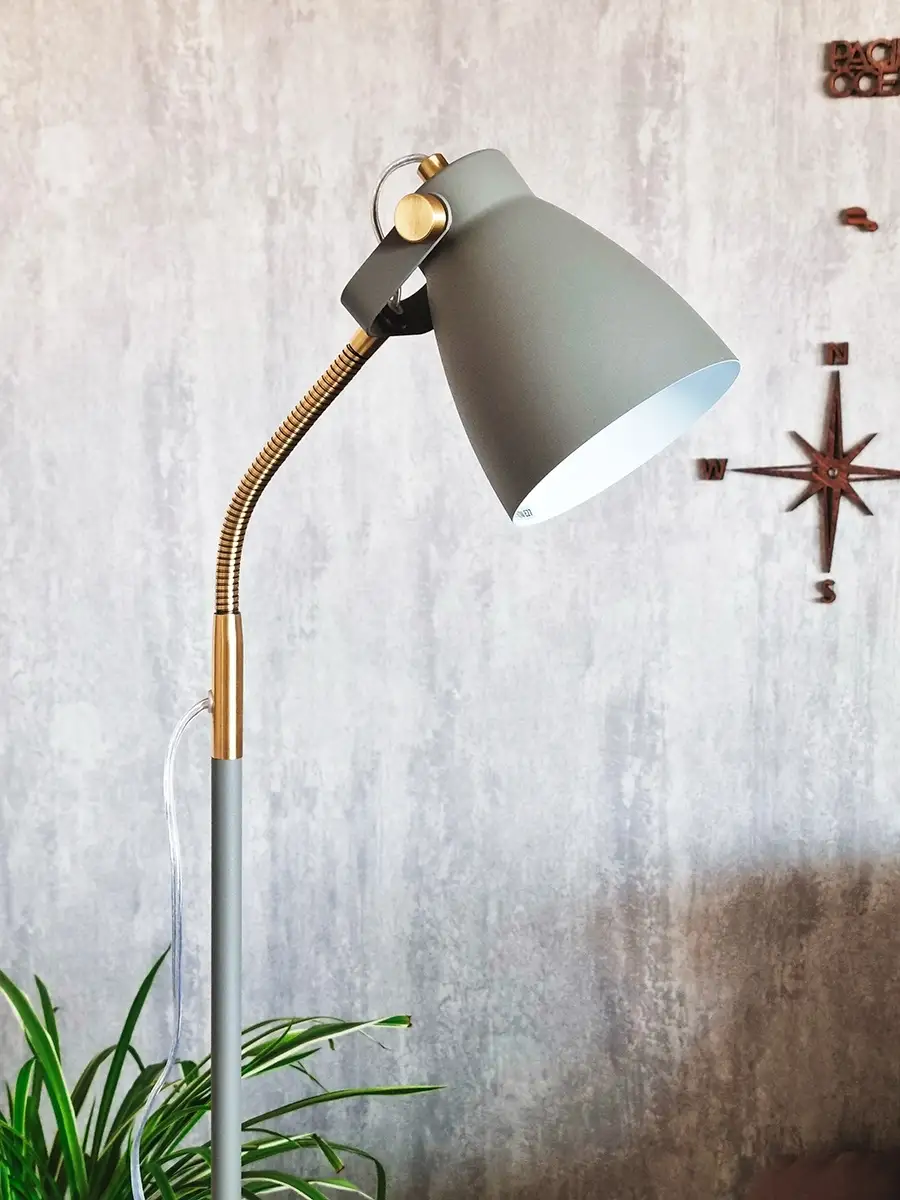 Такие светильники иногда используют вместо верхнего источника света. Обладая достаточной мощностью, они без труда обеспечат необходимый уровень освещения на рабочем месте. Обладают возможностью регулировки угла наклона и поворота плафона и телескопической, наклонной ножкой.