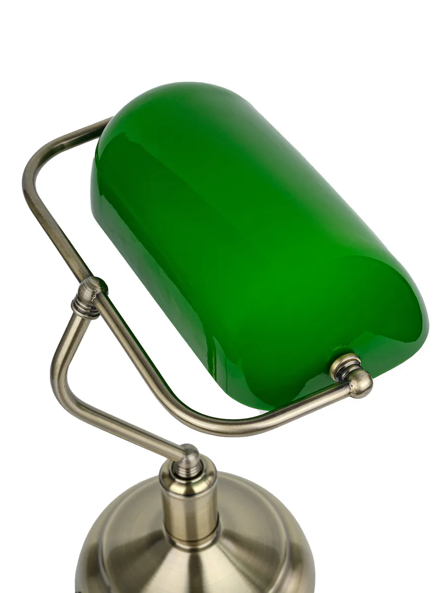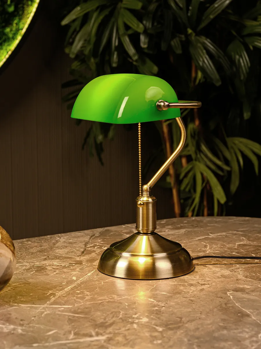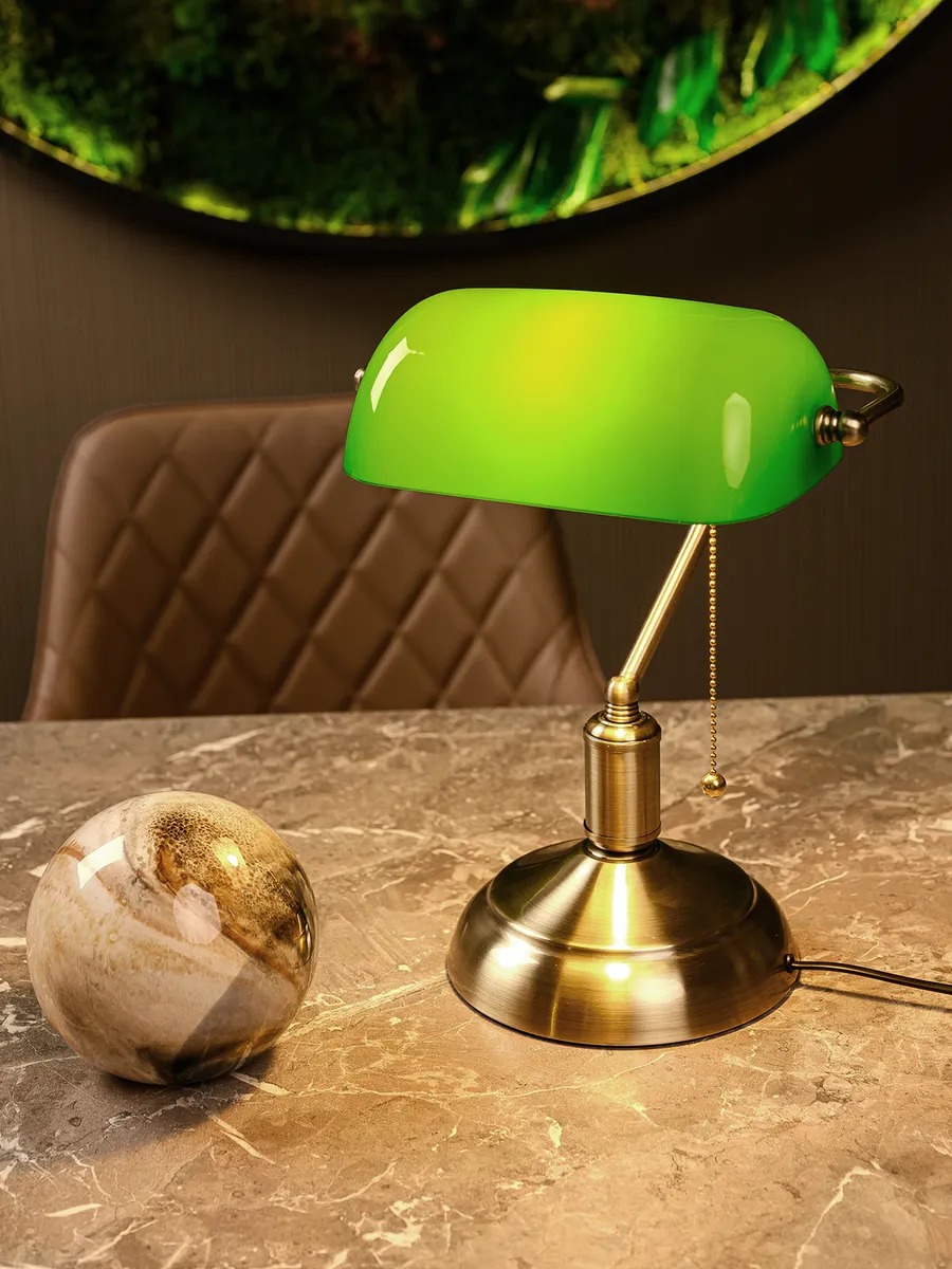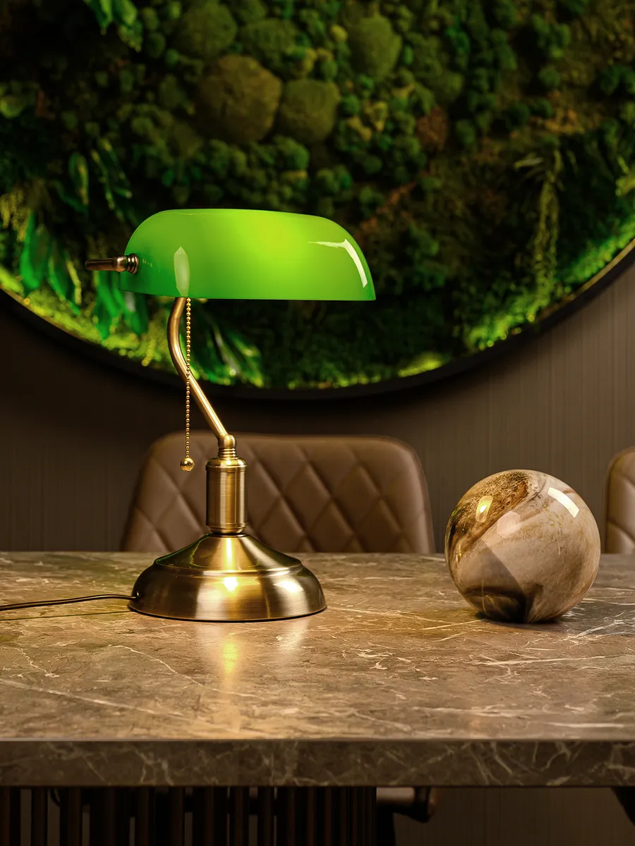 Изготавливаясь с вниманием к деталям, лампа банкира гармонично впишется в интерьер, создавая уютное и теплое освещение. Его уникальный дизайн и высококачественные материалы делают его не только функциональным, но и настоящим произведением искусства. Плафон из закаленного стекла и основание под латунь с патиной привнесут частичку старины в ваш дом или рабочее место с данной лампой. Она идеально подходит для чтения, работы или просто для создания особого вайба.