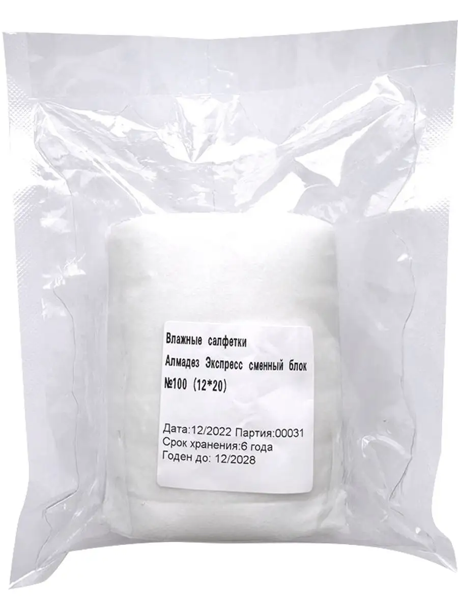 Сменный уже пропитанный блок влажных антибактериальных медицинских спиртовых салфеток, для диспенсера : 66328420. Cалфетки медицинские в индивидуальной упаковке в виде перфорированной ленты 100 салфеток, сформированной в рулон и упакованной в герметичную упаковку, пропитанных средством «Алмадез-экспресс» и упакованных в пленку из мягких полимерных материалов. Пропиточный состав салфеток содержит изопропиловый спирт - 63,5 %, алкилдиметилбензиламмоний хлорид - 0,1 %, функциональные добавки, увлажняющие и ухаживающие за кожей компоненты. Спиртовые салфетки облaдaют cтepилизующим и дезинфицирующим действием, до 4 часов защиты. Герметичная упаковка обеспечивает сохранность антимикробных свойств салфеток на протяжении всего срока годности. Спиртовые салфетки Алмадез Экспресс предназначены для стерилизации кожи до и после инъекций, дезинфекционной обработки мелких травм кожи, рук медицинского персонала и рабочих поверхностей, как средство дезинфекции для обработки рук и экстренной обработки инструментов, обработки кожи при нанесении и уходу за тату.