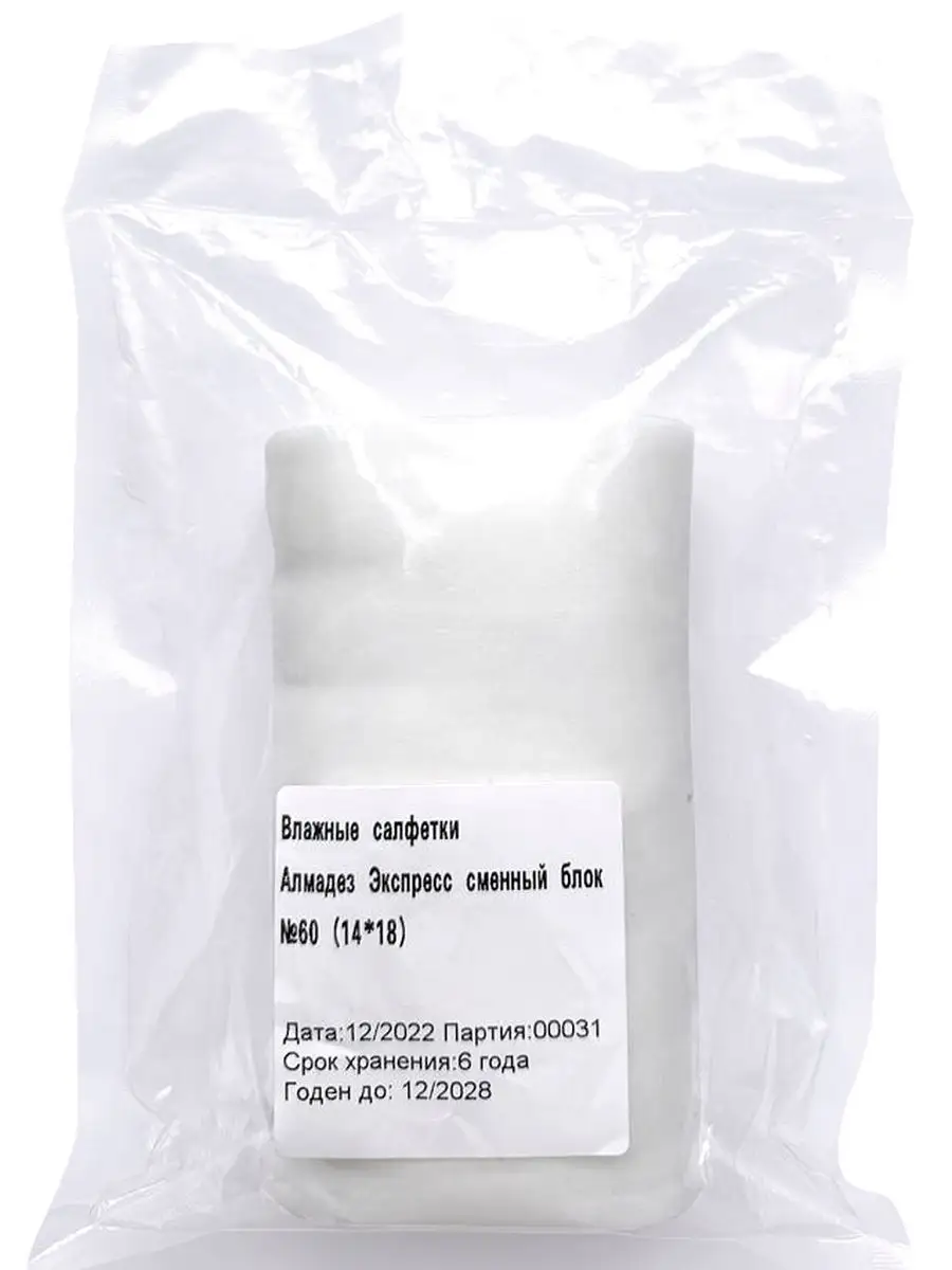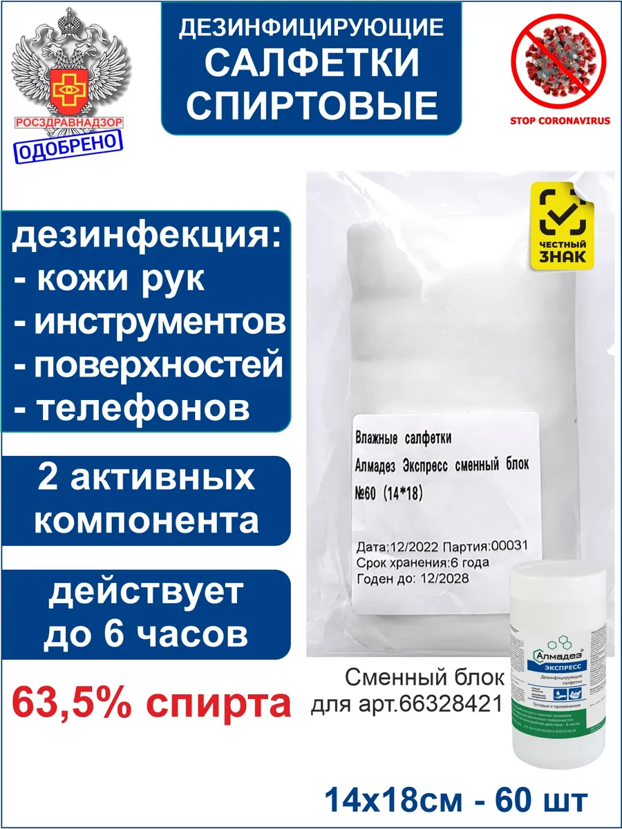 Сменный уже пропитанный блок влажных антибактериальных медицинских спиртовых салфеток в индивидуальной упаковке для диспенсера размером 140х180 мм с пролонгированным действием. Сменный блок представляет собой перфорированную ленту из салфеток, сформированных в рулон, пропитанных средством «Алмадез-экспресс» и упакованных в пленку из мягких полимерных материалов. Основа салфеток изготовлена из нетканого материала в виде перфорированной ленты 60 салфеток, сформированной в рулон и упакованной в герметичную упаковку - емкость диспенсер. Пропиточный состав салфеток содержит изопропиловый спирт - 63,5 %, алкилдиметилбензиламмоний хлорид - 0,1 %, функциональные добавки, увлажняющие и ухаживающие за кожей компоненты. Спиртовые салфетки облaдaют cтepилизующим и дезинфицирующим действием, до 4 часов защиты. Герметичная упаковка обеспечивает сохранность антимикробных свойств салфеток на протяжении всего срока годности. Спиртовые салфетки Алмадез Экспресс предназначены для стерилизации кожи до и после инъекций, дезинфекционной обработки мелких травм кожи, рук медицинского персонала и рабочих поверхностей, как средство дезинфекции для обработки рук и экстренной обработки инструментов, обработки кожи при нанесении и уходу за тату.