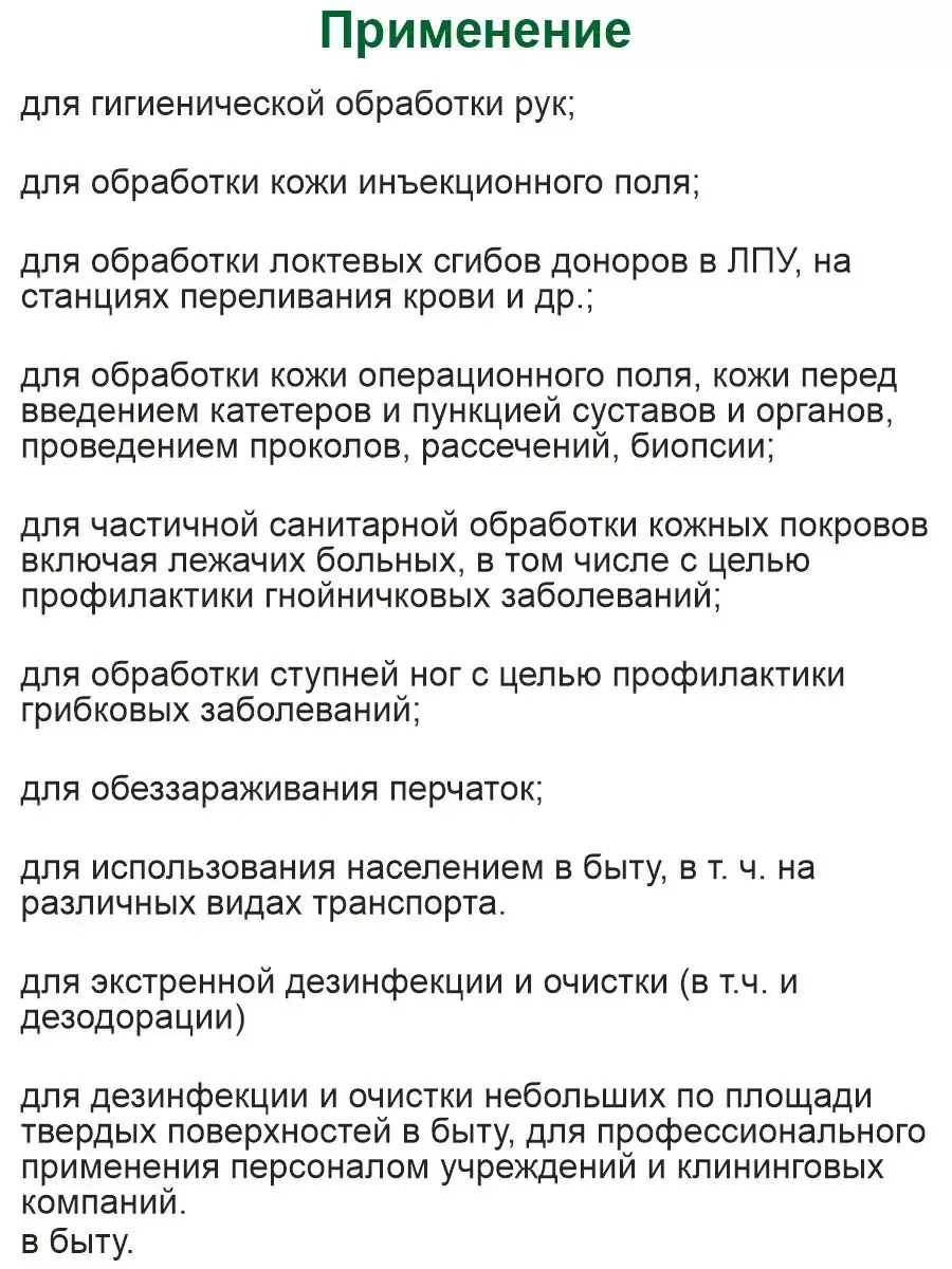 изопропиловый спирт (2-пропанол) – 63,5 %, алкилдиметилбензиламмоний хлорид – 0,1 %, функциональные добавки, увлажняющие и ухаживающие за кожей компоненты.